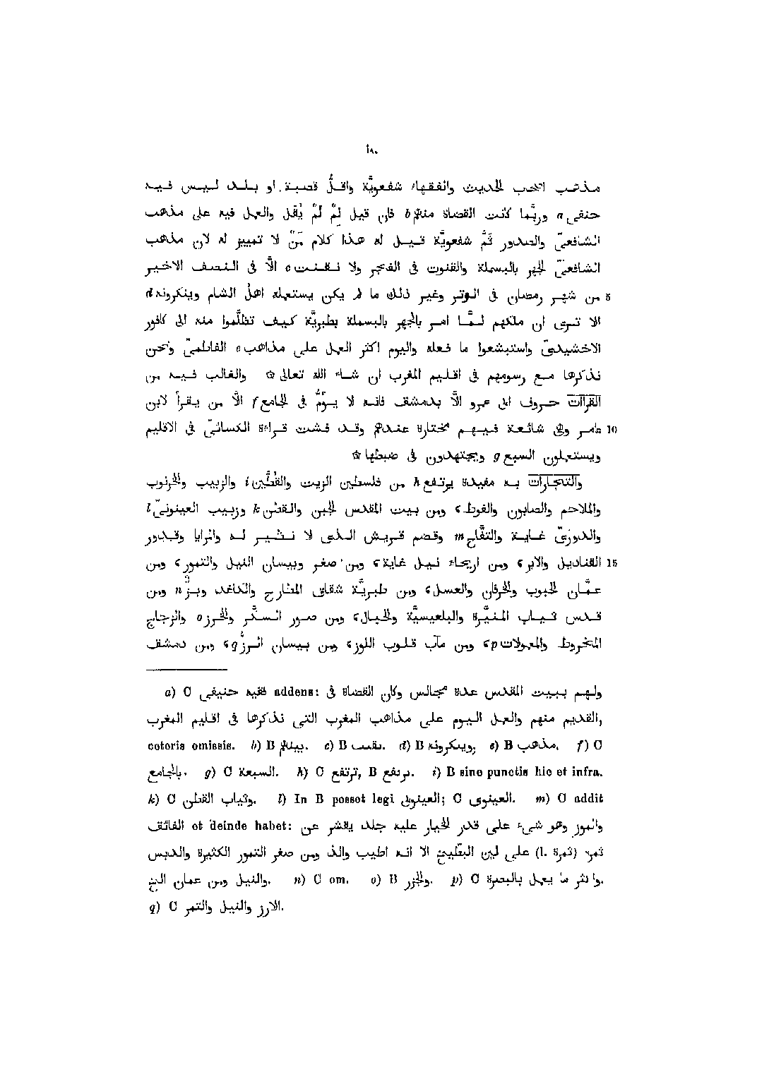 مذهب أصحاب الحديث والفقهاء شفعويّة واقلّ قصبة أو بلد ليس فيه حنفي [1] وربّما كانت القضاة منهم [2] فان قيل لم لم يقل والعمل فيه على مذهب الشافعيّ والصدور ثمّ شفعويّة قيل له هذا كلام من لا تمييز له لان مذهب الشافعيّ الجهر بالبسملة والقنوت في الفجر ولا نقنت [3] الّا في النصف الأخير من شهر رمضان في الوتر وغير ذلك ما لم يكن يستعمله أهل الشام وينكرونه [4] الا ترى ان ملكهم لمّا امر بالجهر بالبسملة بطبريّة كيف تظلّموا منه الى كافور الإخشيديّ واستبشعوا ما فعله واليوم أكثر العمل على مذاهب [5] الفاطمىّ ونحن نذكرها مع رسومهم في إقليم المغرب ان شاء الله تعالى والغالب فيه من القراءات حروف ابى عمرو الّا بدمشق فإنه لا يؤمّ في الجامع [6] الّا من يقرأ لابن عامر وهي شائعة فيهم مختار عندهم وقد فشت قراءة الكسائيّ في الإقليم ويستعملون السبع [7] ويجتهدون في ضبطها والتجارات به مفيدة يرتفع [8] من فلسطين الزيت والقطّين [9] والزبيب والخرنوب والملاحم والصابون والفوط، ومن بيت المقدس الجبن والقطن [10] وزبيب العينونىّ [11] والدورىّ غاية والتفّاح [12] وقضم قريش الّذي لا نظير له والمرايا وقدور القناديل والابر، ومن اريحاء نيل غاية، ومن صغر وبيسان النيل والتمور، ومن عمّان الحبوب والخرفان والعسل، ومن طبريّة شقاق المطارح والكاغد وبزّ [13] ومن قدس ثياب المنيّرة والبلعيسيّة والحبال، ومن صور السكّر والخرز [14] والزجاج المخروط والمعمولات [15] ، ومن مآب قلوب اللوز، ومن بيسان الرزّ [16] ، ومن دمشق