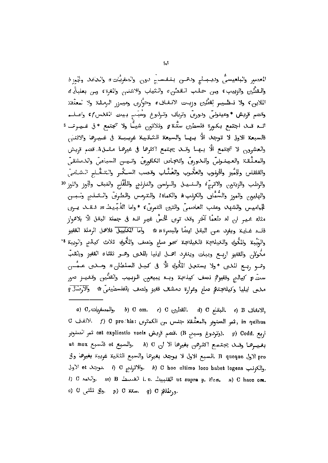 المعصور والبلعيسىّ وديباج ودهن بنفسج دون والصفريّات [1] والكاغذ والجوز [2] والقطّين والزبيب، ومن حلب القطن [3] والثياب والأشنان والمغرة، ومن بعلبكّ [4] الملابن، ولا نظير لقطّين وزيت الإنفاق [5] وحوّارى وميازر الرملة ولا لمعنّقة وقضم قريش وعينونىّ ودوريّ وترياق وترذوغ وسبح بيت المقدس [6] ، واعلم انه قد اجتمع بكورة فلسطين ستّة [7] وثلاثون شيئا ولا تجتمع في غيرها فالسبعة الاولى لا توجد الّا بها والسبعة الثانية غريبة في غيرها والاثنان والعشرون لا تجتمع الّا بها وقد يجتمع أكثرها في غيرها مثل [8] قضم قريش والمعنّقة والعينونىّ والدورىّ وإنجاص الكافوريّ وتين السباعىّ والدمشقيّ والقلقاس والجمّيز والخرنوب والعكّوب والعنّاب وقصب السكر والتفّاح الشامىّ والرطب والزيتون والاترجّ [9] والنيل والراسن والنارنج واللّفّاح والنبق والجوز واللوز والهليون والموز والسّمّاق والكرنب [10] والكماة [11] والترمس والطرىّ والثلج ولبن الجواميس والشهد وعنب العاصميّ والتين التمريّ، واما القبّيط [12] فقد يرى مثله غير ان له طعما آخر وقد ترى الخسّ غيمر انه في جملة البقل الّا بالأهواز فإنه غاية ويفرد عن البقل أيضا بالبصرة [13] واما المكاييل فلأهل الرملة القفيز والويبة والمكّوك والكيلجة فالكيلجة نحو صاع ونصف والمكّوك ثلاث كيالج والويبة مكّوكان والقفيز اربع ويبات وينفرد أهل إيليا بالمدعى وهو ثلثا [14] القفيز وبالقبّ وهو ربع المدى ولا يستعمل المكّوك الّا في كيل السلطان [13] ومدى عمّان ستّ [15] كيالج وقفيزهم نصف كيلجة وبه يبيعون الزبيب والقطّين وقفيز صور مدى إيليا وكيلجتهم صاع وغرارة دمشق قفيز ونصف بالفلسطينيّ والأرطال [16]