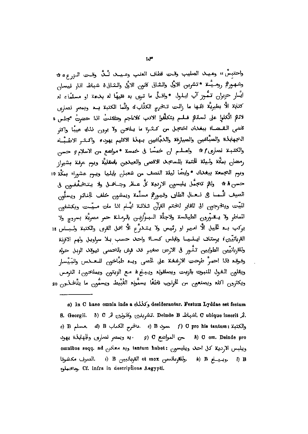واحتبس،، وعيد الصليب وقت قطاف العنب وعيد لدّ وقت الزرع [1] وشهورهم روميّة تشرين الأوّل والثاني كانون الأوّل والثاني [2] شباط آذار نيسان ايّار حزيران تمّوز آب أيلول واقلّ ما ترى به فقيها له بدعة أو مسلما [3] له كتابة الّا بطبريّة فإنها ما زالت تخرج الكتّاب [4] وانّما الكتبة به وبمصر نصارى لانهم اتّكلوا على لسانهم فلم يتكلّفوا الأدب كالاعاجم وكنت إذا حضرت مجلس قاضى القضاة ببغداد اخجل من كثرة ما يلحن ولا يرون ذلك عيبا وأكثر الجهابذة والصبّاغين والصيارفة والدبّاغين بهذا الإقليم يهود [5] وأكثر الأطبّاء والكتبة نصارى [6] واعلم ان خمسا في خمسة مواضع من الإسلام [7] حسن رمضان بمكّة وليلة الختمة بالمسجد الأقصى والعيدين باصقليّة ويوم عرفة بشيراز ويوم الجمعة ببغداد وأيضا ليلة النصف من شعبان بإيليا ويوم عاشوراء بمكّة حسن [8] ولهم تجمّل يلبسون الاردية كلّ عالم وجاهل ولا يتخفّفون في الصيف انّما هي نعال الطاق وقبورهم مسنّمة ويمشون خلف الجنائز ويسلّون الميّت ويخرجون الى المقابر لختم القرآن ثلاثة أيّام إذا مات ميّت ويكشفون المماطر ولا يقوّرون الطيالسة ولا جلّة البزّازين بالرملة حمر مصريّة بسروج ولا يركب به الخيل إلّا أمير أو رئيس ولا يتدرّع الّا أهل القرى والكتبة ولباس القرياتيّين [9] برستاق إيليا ونابلس كساء واحد حسب بلا سراويل ولهم الافرنة وللقرياتيّين الطوابين تنّور في الأرض صغير قد فرش بالحصى فيوقد الزبل حوله وفوقه فإذا احمرّ طرحت الارغفة على الحصى وبه طبّاخون للعدس والبيسار ويقلون الفول المنبوت بالزيت ويصلقونه ويباع [10] مع الزيتون ويملحون [11] الترمس ويكثرون اكله ويصنعون من الخرنوب ناطفا يسمّونه القبّيط ويسمّون ما يتّخذون