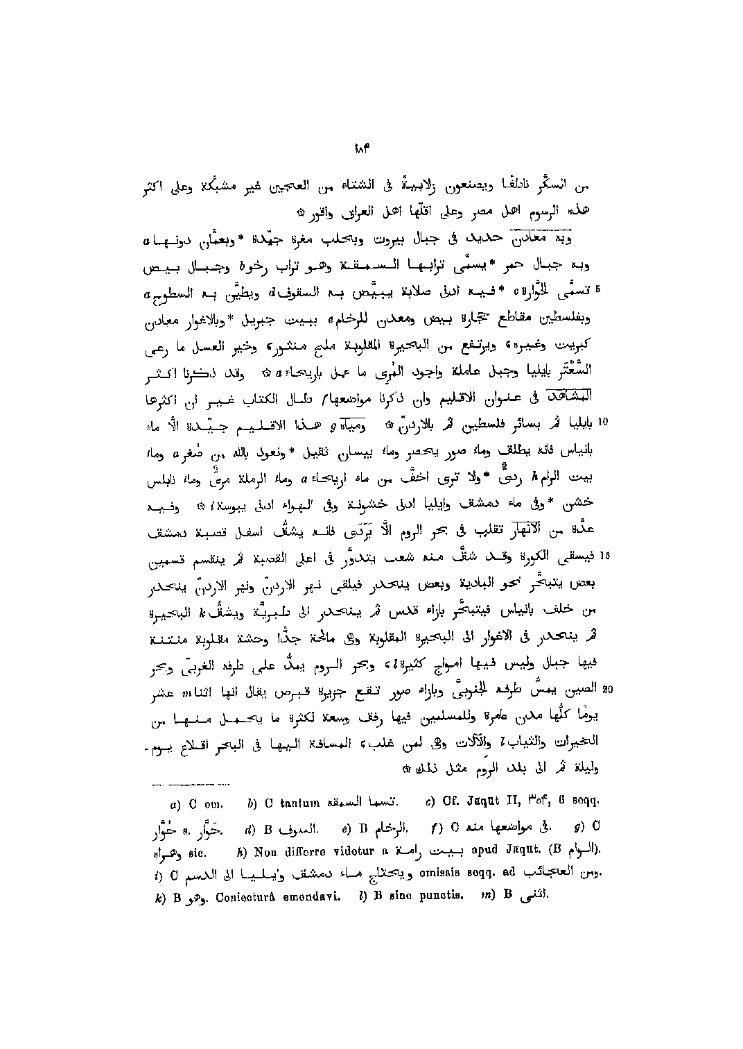 من السكّر ناطقا ويصنعون زلابية في الشتاء من العجين غير مشبّكة وعلى أكثر هذه الرسوم أهل مصر وعلى اقلّها أهل العراق واقور وبه معادن حديد في جبال بيروت وبحلب مغرة جيّدة وبعمّان دونها [1] وبه جبال حمر يسمّى ترابها السمقة وهو تراب رخو [2] وجبال بيض تسمّى الحوّارة [3] فيه ادنى صلابة يبيّض به السوف [4] ويطيّن به السطوح [1] وبفلسطين مقاطع حجارة بيض ومعدن للرخام [5] ببيت جبريل وبالاغوار معادن كبريت وغيره، ويرتفع من البحيرة المقلوبة ملح منثور، وخير العسل ما رعى السّعتر بإيليا وجبل عاملة وأجود المري ما عمل باريحاء [1] وقد ذكرنا أكثر المشاهد في عنوان الإقليم وان ذكرنا مواضعها [6] طال الكتاب غير ان أكثرها بإيليا ثم بسائر فلسطين ثم بالاردنّ ومياه [7] هذا الإقليم جيّدة الّا ماء بانياس فإنه يطلق وماء صور يحصر وماء بيسان ثقيل ونعوذ باللَّه من صغر [1] وماء بيت الرام [8] ولا ترى اخفّ من ماء اريحاء [1] وماء الرملة مري وماء نابلس خشن وفي ماء دمشق وإيليا ادنى خشونة وفي الهواء ادنى يبوسة [9] وفيه عدّة من الأنهار تقلب في بحر الروم الّا بردي فإنه يشقّ أسفل قصبة دمشق فيسقى الكورة وقد شقّ منه شعب يتدوّر في أعلى القصبة ثم ينقسم قسمين بعض يتبحّر نحو البادية وبعض ينحدر فيلقى نهر الاردنّ ونهر الاردنّ ينحدر من خلف بانياس فيتبحّر بإزاء قدس ثم ينحدر الى طبريّة ويشقّ [10] البحيرة ثم ينحدر في الاغوار الى البحيرة المقلوبة وهي مالحة جدّا وحشة مقلوبة منتنة فيها جبال وليس فيها أمواج كثيرة [11] ، وبحر الروم يمّ على طرفه الغربىّ وبحر الصين يمسّ طرفه الجنوبىّ وبإزاء صور تقع جزيرة قبرص يقال انها اثنا [12] عشر يوما كلّها مدن عامرة وللمسلمين فيها رفق وسعة لكثرة ما يحمل منها من الخيرات والثياب [11] والآلات وهي لمن غلب، المسافة اليها في البحر إقلاع يوم وليلة ثم الى بلد الروم مثل ذلك