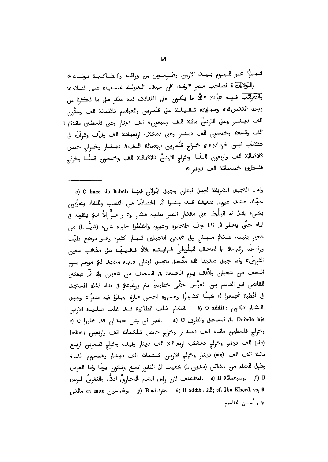 .Deindehic [4] في الساحل والطرق C وخراج فلسطين مائة ألف دينار وخراج حمص ثلاثمائة ألف وأربعين (sic) habet:ألف دينار وخراج دمشق اربعمائة ألف دينار ونيف وخراج قنسرين اربع مائة ألف ألف (sic) دينار وخراج الأردن ثلاثمائة ألف دينار وخمسون ألف، وطول الشام من مدائن (مدين (l.شعيب الى الثغور تسع وثلاثون يوما واما العرض. فيختلف لان راس الشام الحجازىّ ادقّ والثغريّ اعرض