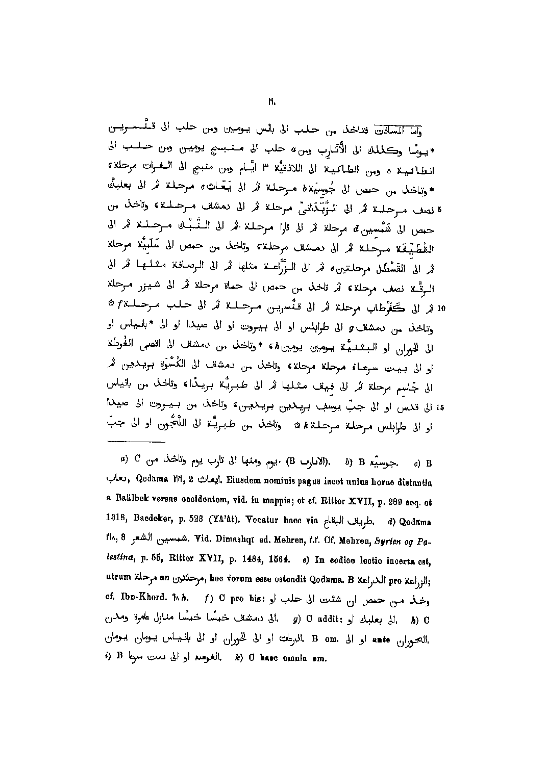 واما المسافات فتأخذ من حلب الى بالس يومين ومن حلب الى قنّسرين يوما وكذلك الى الأثارب ومن [1] حلب الى منبج يومين ومن حلب الى انطاكية ومن انطاكية الى الاذقيّة 3 أيّام ومن منبج الى الفرات مرحلة، وتأخذ من حمص الى جوسيّة [2] مرحلة ثم الى يعاث [3] مرحلة ثم الى بعلبكّ نصف مرحلة ثم الى الزّبدانيّ مرحلة ثم الى دمشق مرحلة، وتأخذ من حمص الى شمسين [4] مرحلة ثم الى قارا مرحلة ثم الى البنك مرحلة ثم الى القطيفة مرحلة ثم الى دمشق مرحلة، وتأخذ من حمص الى سلميّة مرحلة ثم الى القسطل مرحلتين [5] ثم الى الزّرّاعة مثلها ثم الى الرصافة مثلها ثم الى الرقّة نصف مرحلة، ثم تأخذ من حمص الى حماة مرحلة ثم الى شيزر مرحلة ثم الى كفرطاب مرحلة ثم الى قنّسرين مرحلة ثم الى حلب مرحلة [6] وتأخذ من دمشق [7] الى طرابلس أو الى بيروت الى صيدا أو الى بانياس أو الى الحوران أو البثنيّة يومين يومين [8] ، وتأخذ من دمشق الى أقصى الغوطة أو الى بيت سرعا [9] مرحلة مرحلة وتأخذ من دمشق الى الكسوة بريدين ثم الى جاسم مرحلة ثم الى فيق مثلها ثم الى طبريّة بريدا، وتأخذ من بانياس الى قدس أو الى جبّ يوسف بريدين بريدين، وتأخذ من بيروت الى صيدا أو الى طرابلس مرحلة مرحلة [10] وتأخذ من طبريّة الى اللّجّون أو الى جبّ