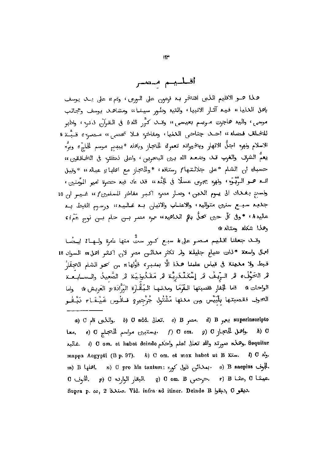 هذا هو الإقليم الّذي افتخر به فرعون على الورى، وقام [1] على يد يوسف بأهل الدنيا فيه آثار الأنبياء، والتيه وطور سينا،، ومشاهد يوسف وعجائب موسى، واليه هاجرت مريم بعيسى،، وقد كرّر الله [2] في القرآن ذكره، وأظهر للخلق فضله،، أحد جناحي الدنيا، ومفاخره فلا تحصى،، مصره [3] قبة الإسلام ونهره اجلّ الأنهار وبخيراته تعمر [4] الحجاز وبأهله يبهج موسم الحاجّ [5] وبرّه يعمّ الشرق والغرب قد وضعه الله بين البحرين، وأعلى ذكره في الخافقين،، حسبك ان الشام على جلالتها [6] رستاقه، والحجاز مع أهلها [7] عياله،، وقيل انه هو الرّبوه، ونهره يجرى عسلا في الجنّة،، قد عاد فيه حضرة أمير المؤمنين، ونسخ بغداد الى يوم الدين، وصار مصره أكبر مفاخر المسلمين [6] ،، غير ان جدبه سبع سنين متوالية، والأعناب والإتيان به غالية،، ورسوم القبط به عاليه [8] ، وفي كلّ حين تحلّ بهم انداهيه،، عمره مصر بن حام بن نوح عم [9] ، وهذا شكله ومثاله وقد جعلنا إقليم مصر على [10] سبع كور ست منها عامرة ولها [11] أيضا اعمال واسعة ذات ضياع جليلة ولم تكثر مدائن مصر لان أكثر أهل [12] السواد قبط ولا مدينة في قياس علمنا هذا الّا بمنبر، فاوّلها [13] من نحو الشام الجفار ثم الحوف [14] ثم الرّيف ثم إسكندريّة ثم مقدونية ثم الصّعيد والسابعة الواحات فاما الجفار فقصبتها الفرما ومدنها البقّارة الواردة [15] العريش واما الحوف فقصبتها بلبيس ومن مدنها مشتول جرجير [16] فاقوس غيفا [17] دبقو