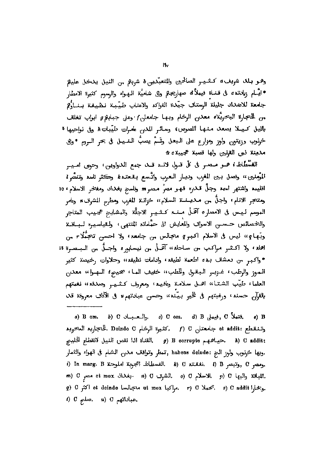وهو بلد شريف [1] كثير الصالحين والمتعبّدين [2] شربهم من النيل يدخل عليهم أيّام زيادته [3] في قناة فيملأ [4] صهاريجهم وهي شاميّة الهواء والرسوم كثيرة الامطار جامعة للاضداد جليلة الرستاق جيّدة الفواكه والأعناب طيّبة نظيفة بناؤهم من الحجارة البحريّة [5] معدن الرخام وبها جامعان [6] وعلى جبابهم [7] أبواب تغلق بالليل كيلا يصعد منها اللصوص، وسائر المدن عامرات طيّبات [8] وفي نواحيها خزنوب وزيتون ولوز ومزارع على البعل وثمّ يصبّ النيل في بحر الروم وهي مدينة ذي القرنين ولها قصبة عجيبة [3] الفسطاط [9] هو مصر في كلّ قول لانه قد جمع الدواوين، وحوى أمير المؤمنين،، وفصل بين المغرب وديار العرب واتّسع بقعته [10] وكثر ناسه وتنضّر [11] إقليمه واشتهر اسمه وجلّ قدره فهو مصر مصر [12] وناسخ بغداد ومفخر الإسلام، ومتجر الأنام، واجلّ من مدينة السلام،، خزانة المغرب ومطرح المشرق [13] وعامر الموسم ليس في الأمصار [14] أهل منه كثير الاجلّة والمشايخ عجيب المتاجر والخصائص حسن الأسواق والمعايش الى حمّاماته المنتهى، ولقياسيره لباقة وبها [15] ،، ليس في الإسلام أكبر [16] مجالس من جامعه، ولا أحسن تجمّلا [17] من اهله، ولا أكثر مراكب من ساحله،، أهل من نيسابور [18] واجلّ من البصرة وأكبر من دمشق به [3] اطعمة لطيفه، وادامات نظيفة،، وحلاوات رخيصة كثير الموز والرطب، غزير البقول والحطب، خفيف الما، صحيح [19] الهوا،، معدن العلماء، طيّب الشتا،، أهل سلامة وعافية، ومعروف كثير وصدقه،، نغمتهم بالقرآن حسنه، ورغبتهم في الخير بيّنه،، وحسن عبادتهم [20] في الآفاق معروفة قد