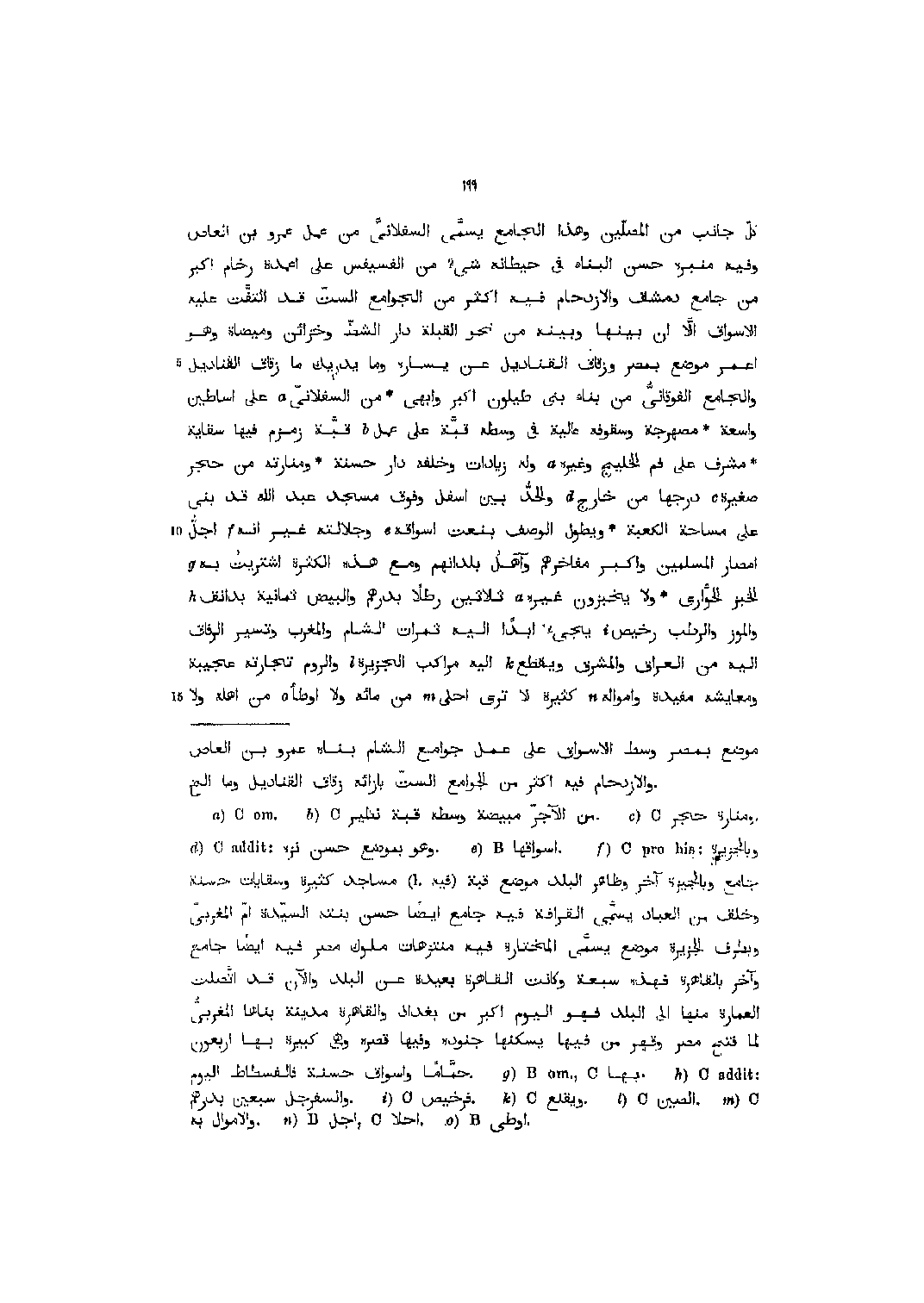 كلّ جانب من المصلّين وهذا الجامع يسمّى السفلانىّ من عمل عمرو بن العاص وفيه منبره حسن البناء في حيطانه شيء من الفسيفس على اعمدة رخام أكبر من جامع دمشق والازدحام فيه أكثر من الجوامع الستّ قد التفّت عليه الأسواق الّا ان بينها وبينه من نحو القبلة دار الشطّ وخزائن وميضاة وهو اعمر موضع بمصر وزقاق القناديل عن يساره وما يدريك ما زقاق القناديل والجامع الفوقانىّ من بناء بنى طيلون أكبر وابهى من السفلانىّ [1] على أساطين واسعة مصهرجة وسقوفه عالية في وسطه قبّة على عمل [2] قبّة زمزم فيها سقاية مشرق على فم الخليج وغيره [1] وله زيادات وخلفه دار حسنة ومنارته من حجر صغيرة [3] درجها من خارج [4] والحدّ بين أسفل وفوق مسجد عبد الله قد بنى على مساحة الكعبة ويطول الوصف بنعت اسواقه [5] وجلالته غير انه [6] اجلّ أمصار المسلمين وأكبر مفاخرهم وأهل بلدانهم ومع هذه الكثرة اشتريت به [7] الخبز الحوّارى ولا يخبرون غيره [1] ثلاثين رطلا بدرهم والبيض ثمانية بدانق [8] والموز والرطب رخيص [9] يجيء ابدا اليه ثمرات الشام والمغرب أو تيسر الرفاق اليه من العراق والمشرق ويقطع [10] اليه مراكب الجزيرة [11] والروم تجارته عجيبة ومعايشة مفيدة وأمواله [12] كثيرة لا ترى احلى [13] من مائة ولا اوطأ [14] من اهله ولا