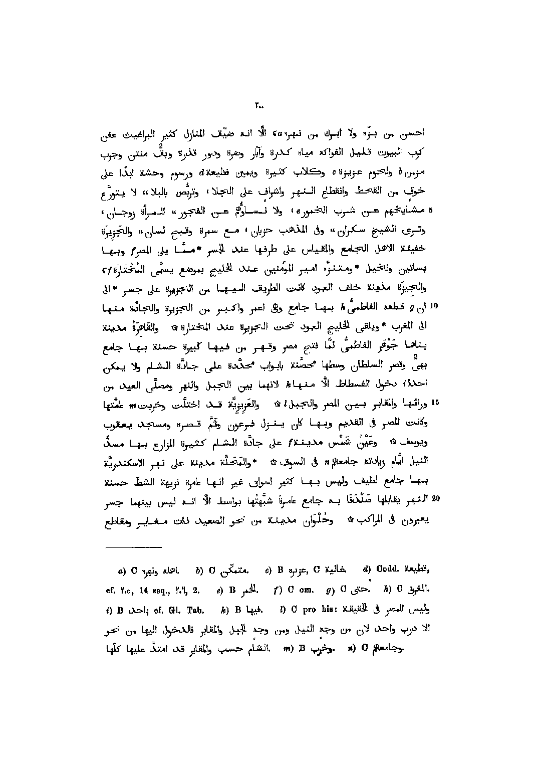 أحسن من بزّه ولا ابرك من نهر [1] ، الّا انه ضيّق المنازل كثير البراغيث عفن كرب البيوت قليل الفواكه مياه كدرة وآبار وضرة ودور قذرة وبقّ منتن وجرب مزمن [2] ولحوم عزيزة [3] وكلاب كثيرة ويمين فظيعة [4] ورسوم وحشة ابدا على خوف من القحط وانقطاع النهر وأشراف على الجلا، وتربّص بالبلا،، لا يتورع مشايخهم عن شرب الخمور [5] ، ولا نساؤهم عن الفجور،، للمرأة زوجان، وترى الشيخ سكران وفي المذهب حزبان، مع سمرة وقبح لسان والجزيرة خفيفة الأهلي الجامع والمقياس على طرفها عند الجسر ممّا يلي المصر [6] وبها بساتين ونخيل ومتنزّه أمير المؤمنين عند الخليج بموضع يسمّى المختارة [6] ، والجيزة مدينة خلف العمود كانت الطريق اليها من الجزيرة على جسر الى ان [7] قطعه الفاطميّ [8] بها جامع وهي اعمر وأكبر من الجزيرة والجادّة منها الى المغرب ويلقى الخليج العمود تحت الجزيرة عند المختارة والقاهرة مدينة بناها جوهر الفاطميّ لمّا فتح مصر وقهر من فيها كبيرة حسنة بها جامع بهىّ وقصر السلطان وسطها محصّنة بأبواب محدّدة على جادّة الشام ولا يمكن أحدا [9] دخول الفسطاط الّا منها [10] لأنهما بين الجبل والنهر ومصلّى العيد من ورائها والمقابر بين المصر والجبل [11] والعزيزيّة قد اختلّت وخربت [12] عامّتها وكانت المصر في القديم وبها كان ينزل فرعون وثمّ قصره ومسجد يعقوب ويوسف وعين شمس مدينة [6] على جادّة الشام كثيرة المزارع بها مسدّ النيل أيّام زيادته جامعهم [13] في السوق والمحلّة مدينة على نهر الاسكندريّة بها جامع لطيف وليس بها كثير أسواق غير انها عامرة نزيهة الشطّ حسنة النهر يقابلها صندفا به جامع عامرة شبّهتها بواسط الّا انه ليس بينهما جسر يعبرون في المراكب وحلوان مدينة من نحو الصعيد ذات مغاير ومقاطع