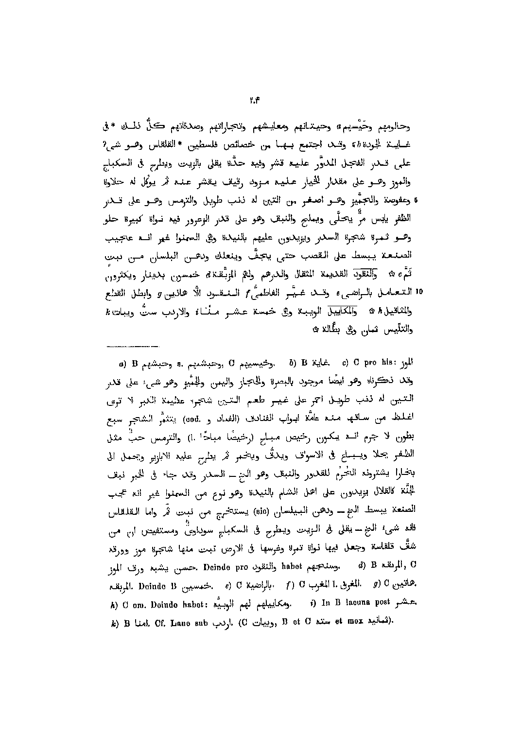 [3] الموز Cprohis:وقد ذكرناه وهو أيضا موجود بالبصرة والحجاز واليمن والجمّيز وهو شيء على قدر التين له ذنب طويل احمر على غير طعم التين شجره عظيمة الكبر لا ترى اغلظ من ساقها منه عامّة أبواب الفنادق (الفناد و (cod.يتثمّر الشجر سبع بطون لا جرم انه يكون رخيص مباح (رخيصا مباحا (l.والترمس حبّ مثل الظفر يجلا ويباع في الأسواق ويدقّ ويخمر ثم يطرح عليه الأبازير ويحمل الى ببخارا يشترونه الحرم للقدور والنبق وهو إلخ- السدر وقد جاء في الخبر نبق الجنّة كالقلال يزيدون على أهل الشام بالنيدة وهو نوع من السمنوا غير انه عجب الصنعة يبسط إلخ- ودهن البلسان sic يستخرج من نبت ثم واما القلقاس فإنه شيء إلخ- يقلى في الزيت ويطرح في السكباج سوداوى ومستفيض ان من شقّ قلقاسة وجعل فيها نواة تمرة وغرسها في الأرض نبت منها شجرة موز وورقه. وسنجهم tebah والنقود orpednieD.حسن يشبه ورق الموز