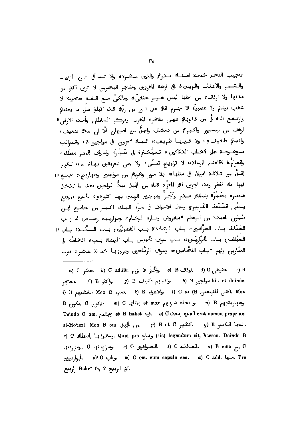 عجيب اللحم خمسة أمناء بدرهم والتين عشرة [1] ولا تسأل عن الزبيب والتمر والأعناب والزيت [2] هي فرضة المغربين ومتجر البحرين لا ترى أكثر من مدنها ولا ارفق [3] من أهلها ليس غير حنفيّ [4] ومالكيّ مع الفة عجيبة لا شغب بينهم ولا عصبيّة لا جرم انهم على نور من ربّهم قد أقبلوا على ما يعنيهم وارتفع الغلّ من قلوبهم فهي مفخر [5] المغرب ومركز السلطان وأحد الأركان ارفق من نيسابور وأكبر [6] من دمشق واجلّ من أصبهان الّا ان ماءهم ضعيف، وأدبهم طفيف [7] ، ولا فيها ظريف،، الماء مخزون في مواجين [8] ، والضرائب موضوعة على أصحاب الدكاكين، تعيّشهم [9] في صبرة وأسواق المصر معطّلة، والعوامّ [10] كالأغنام المرسلة،، لا تراويح تصلّى، ولا بقي للفريقين بها [11] ما،، تكون اقلّ من ثلاثة أميال في مثلها [12] بلا سور وشربهم من مواجين وصهاريج [13] يجتمع فيها ماء المطر وقد اجرى لهم المعزّ [14] قناة من الجبل تملأ المواجين بعد ما تدخل قصره بصبرة بنيانهم مدر وآجرّ ومواجين الزيت بها كثيرة [15] ، الجامع بموضع يسمّى السّماط الكبير [16] وسط الأسواق في سرّة البلد أكبر من جامع ابن طيلون بأعمدة من الرخام مفروش وباره؟ الرخام [17] ومزاريبه رصاص له باب السّماط باب الصرّافين [18] باب الرهادنة باب الفضوليّين باب المئذنة [19] باب الصبّاغين باب الحوّاريّين [20] باب سوق الخميس باب الميضاة باب [21] الخاصّة في التمّارين ولهم باب اللحّامين [22] وسوق الرّماحين ودروبها خمسة عشر [23] درب