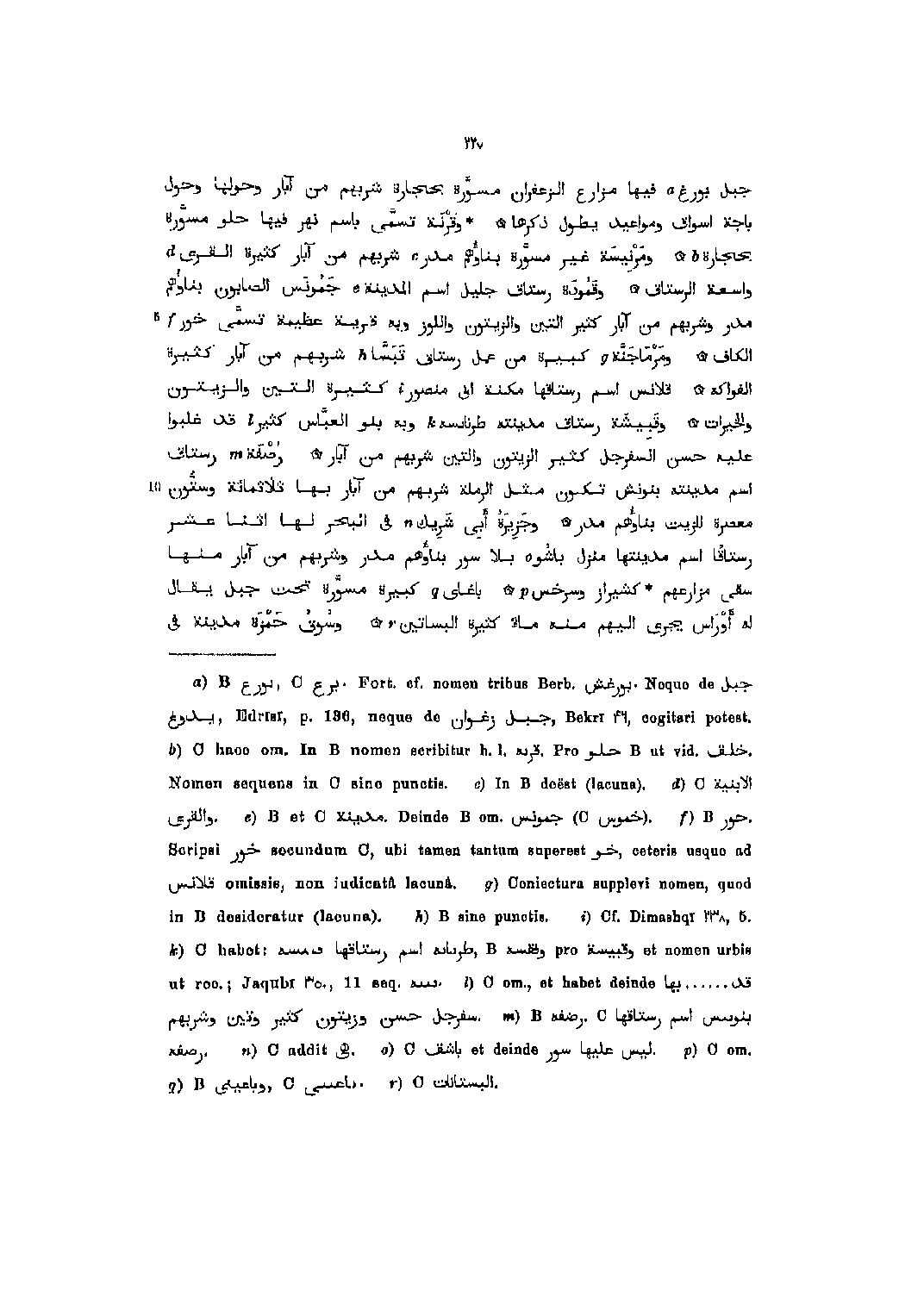 جبل بورغ [1] فيها مزارع الزعفران مسوّرة بحجارة شربهم من آبار وحولها وحول باجة أسواق ومواعيد يطول ذكرها وقرنة تسمّى باسم نهر فيها حلو مسوّرة بحجارة [2] ومرنيسة غير مسوّرة بناؤهم مدر [3] شربهم من آبار كثيرة القرى [4] واسعة الرستاق وقمودة رستاق جليل اسم المدينة [5] جمونس الصابون بناؤهم مدر وشربهم من آبار كثير التين والزيتون واللوز وبه قرية عظيمة تسمّى خور [6] الكاف ومرماجنّة [7] كبيرة من عمل رستاق تبسّا [8] شربهم من آبار كثيرة الفواكه قلانس اسم رستاقها مكنة ابى منصور [9] كثيرة التين والزيتون والخيرات وقبيشة رستاق مدينة طرناسه [10] وبه بنو العبّاس كثير [11] قد غلبوا عليه حسن السفرجل كثير الزيتون والتين شربهم من آبار رصفة [12] رستاق اسم مدينته بنونش تكون مثل الرملة شربهم من آبار بها ثلاثمائة وستّون معصرة للزيت بناؤهم مدر وجزيرة أبى شريك [13] في البحر لها اثنا عشر رستاقا اسم مدينتها منزل باشو [14] بلا سور بناؤهم مدر وشربهم من آبار منها سقى مزارعهم كشيراز وسرخس [15] باغلى [16] كبيرة مسوّرة تحت جبل يقال له أوراس يجرى اليهم منه ماء كثيرة البساتين [17] وسوق حمزة مدينة في