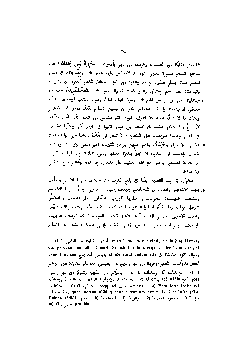البحر بناؤهم من الطوب [1] وشربهم من نهر وأعين وجزيرة بنى زغنّاية [2] على ساحل البحر مسوّرة يعبر منها الى الأندلس ولهم عيون ومتّيجة [3] في مرج لهم ماء جار عليه ارحية وشعبة من النهر تدخل الدور كثيرة البساتين وهياجة [4] على اسم رستاقها وهو واسع كثيرة القموح والقسطنطينيّة مدينة [5] جاهليّة على يومين من المصر ولولا خوف الملال وطول الكتاب لوصفت بقيّة مدائن افريقية [6] وأكثر مدائن الكور في جميع الإسلام ولكنّا نميل الى الإيجاز ونذكر ما لا بدّ منه ولا اعرف كورة أكثر مدائن من هذه كلّها آهلة جيّدة لانّا ربّما نذكر مدنا هي أصغر من قرى كثيرة في إقليم أخر ولكنّها مشهورة في المدن وعلمنا موضوع على التعارف ألا ترى ان مخا والجامعين والمنيفة [7] مدن بلا نزاع وكفر سلّام وقصر الرّيح وراس التين [8] أكبر منهنّ وهي [9] قرى بلا خلاف واعلم ان الكورة لا تجلّ بكثرة مدنها ولكن بجلالة رساتيقها ألا ترى الى جلالة نيسابور وبخارا مع قلّة مدنهما والى بئيس زبيد [10] وهجر مع كثرة مدنهما تاهرت هي اسم القصبة أيضا هي بلخ المغرب قد احدق بها الأنهار والتفّت بها الأشجار وغابت في البساتين ونبعت حولها الأعين وجلّ بها الإقليم وانتعش فيها [11] الغريب واستطابها اللبيب يفضّلونها على دمشق واخطئوا وعلى قرطبة وما أظنّهم أصابوا [12] هو بلد كبير كثير الخير رحب رفق طيّب رشيق الأسواق غزير الماء جيّد الأهل قديم الوضع محكم الرصف عجيب لو غير انه متى يقاس المغرب بالشام واين مثل دمشق في الإسلام