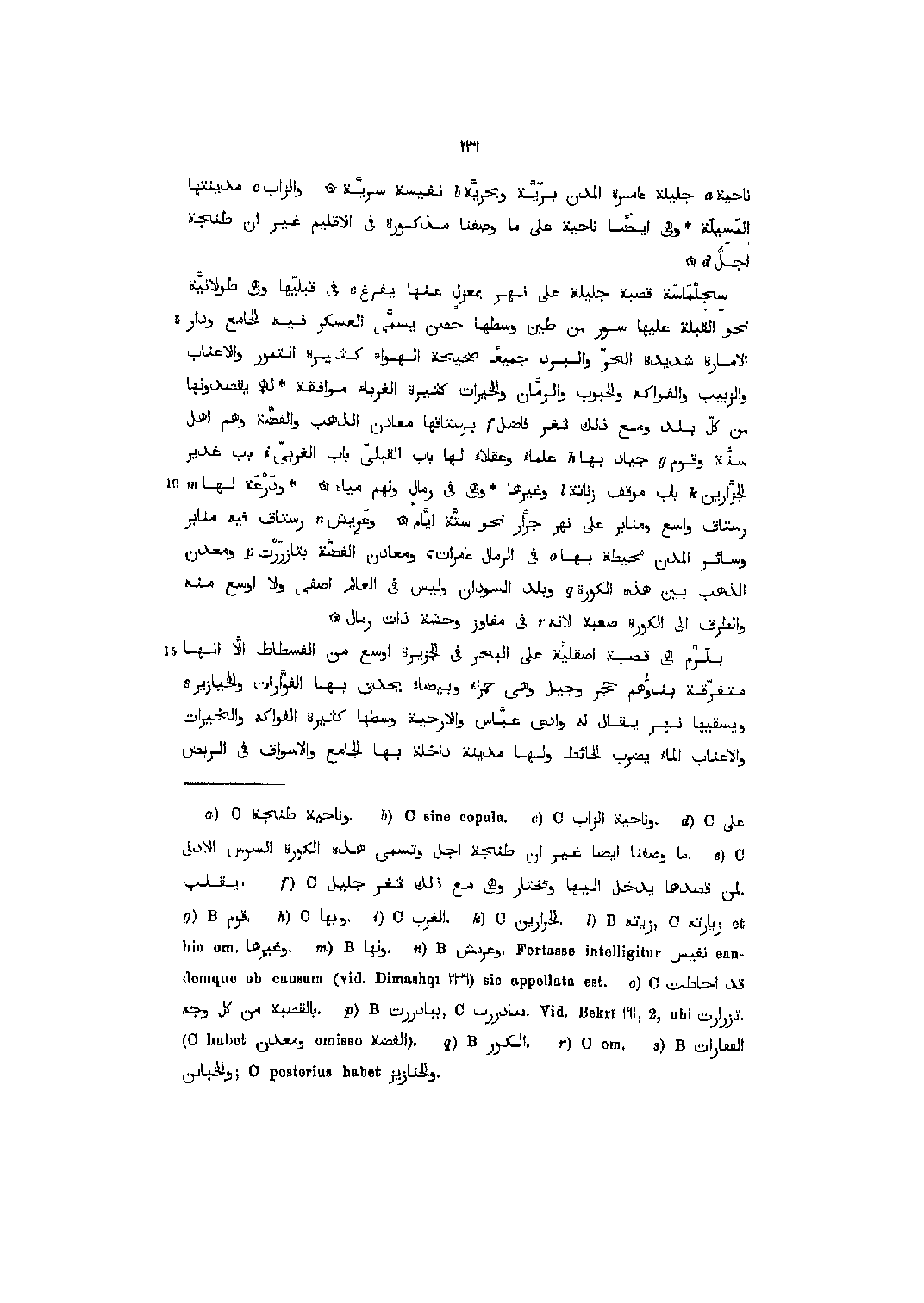ناحية [1] جليلة عامرة المدن برّيّة وبحريّة [2] نفيسة سريّة والزاب [3] مدينتها المسيلة وهي أيضا ناحية على ما وصفنا مذكورة في الإقليم غير ان طنجة اجلّ [4] سجلماسة قصبة جليلة على نهر بمعزل عنها يفرغ [5] في قبليّها وهي طولانيّة نحو القبلة عليها سور من طين وسطها حصن يسمّى العسكر فيه الجامع ودار الامارة شديدة الحرّ والبرد جميعا صحيحة الهواء كثيرة التمور والأعناب والزبيب والفواكه والحبوب والرمّان والخيرات كثيرة الغرباء موافقة لهم يقصدونها من كلّ بلد ومع ذلك ثغر فاضل [6] برستاقها معادن الذهب والفضّة وهم أهل سنّة وقوم [7] جياد بها [8] علماء وعقلاء لها باب القبليّ باب الغربىّ [9] باب غدير الجزّارين [10] باب موقف زنانة [11] وغيرها وهي في رمال ولهم مياه ودرعة لها [12] رستاق واسع ومنابر على نهر جرّار نحو ستّة أيّام وعريش [13] رستاق فيه منابر وسائر المدن محيطة بها [14] في الرمال عامرات، ومعادن الفضّة بتازرت [15] ومعدن الذهب بين هذه الكورة [16] وبلد السودان وليس في العالم أصفى ولا أوسع منه والطرق الى الكورة صعبة لانه [17] في مفاوز وحشة ذات رمال بلرم هي قصبة اصقليّة على البحر في الجزيرة أوسع من الفسطاط الّا انها متفرّقة بناؤهم حجر وجيل وهي حمراء وبيضاء يحدق بها الفوّارات والخيازير [18] ويسقيها نهر يقال له وادي عبّاس والارحية وسطها كثيرة الفواكه والخيرات والأعناب الماء يضرب الحائط ولها مدينة داخلة بها الجامع والأسواق في الربض