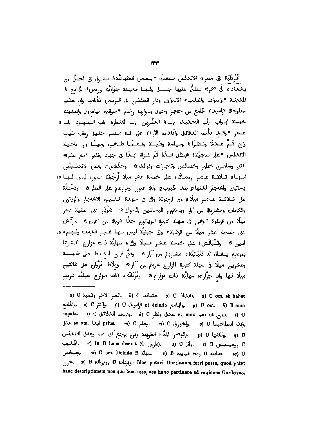 قرطبة هي مصر [1] الأندلس سمعت بعض العثمانيّة [2] يقول هي اجلّ من بغداد [3] في صحراء يطلّ عليها جبل ولها مدينة جوّانيّة وربض [4] الجامع في المدينة وأسواق وأغلب [5] الأسواق ودار السلطان في الربض قدّامها واد عظيم سطوحهم قراميد [6] الجامع من حجر وجيل وسواريه رخام حواليه مياض [7] وللمدينة خمسة أبواب باب الحديد باب [8] العطّارين باب القنطرة باب اليهود باب عامر وقد دلّت الدلائل واتّفقت الآراء [9] على انه مصر جليل رفق طيّب وان ثمّ عدلا ونظرا [10] وسياسة وطيبة ونعما ظاهرة ودينا وان ناحية الأندلس على سجيّة [11] هيطل ابدا ثمّ غزاة ابدا في جهاد ونفير مع علم [12] كثير وسلطان خطير وخصائص وتجارات وفوائد وحدّثنى [13] بعض الاندلسيّين انها [14] ثلاثة عشر رستاقا، على خمسة عشر ميلا أرجونة مسوّرة ليس لها بساتين وأشجار لكنها [15] بلد الحبوب [16] ولهم عيون ومزارعهم على المطر وقسطلّة على ثلاثة عشر ميلا [7] من ارجونة وهي في سهلة كثيرة الأشجار والزيتون والكرمات ومشاربهم من آبار ويسقون البساتين بالسواني شوذر على ثمانية عشر ميلا من قرطبة وهي في سهلة كثيرة الزيتون جدّا شربهم من أعين مارتش على خمسة عشر ميلا من قرطبة [17] وهي جبليّة ليس لها غير الكرمات ولهم [18] أعين وقنبانش [19] على خمسة عشر ميلا وهي [20] سهليّة ذات مزارع أكثرها بموضع يقال له قنبانية [21] مشاربهم من آبار وفجّ ابن لقيط على خمسة وعشرين ميلا في سهلة كثيرة المزارع شربهم من آبار وبلاط مروان على ثلاثين ميلا لها واد جرّار [22] سهليّة ذات مزارع وبريانة [23] ذات مزارع سهليّة شربهم