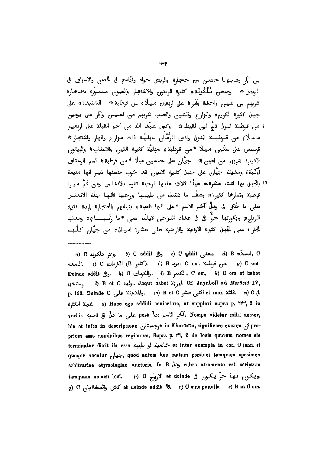 من آبار وفيها حصن من حجارة والربض حوله والجامع في الحصن والأسواق في الربض وحصن بلكونة [1] كثيرة الزيتون والأشجار والعيون مسوّرة بحجارة شربهم من عين واحدة وآبار [2] على أربعين ميلا [3] من قرطبة الشنيدة [4] على جبل كثيرة الكروم [5] والمزارع والتين والعنب شربهم من أعين وآبار على يومين من قرطبة المنزل فجّ ابن لقيط وادي عبد الله من نحو القبلة على أربعين ميلا [6] من قرطبة المنزل وادي الرّمّان سهليّة ذات مزارع وانهار وأشجار قرسيس على ستّين ميلا من قرطبة [7] سهليّة كثيرة التين والأعناب [8] والزيتون الكبير [9] شربهم من أعين جيّان على خمسين ميلا من قرطبة [10] اسم الرستاق أولبة [11] ومدينة جيّان على جبل كثيرة الأعين قد خرب حصنها غير انها منيعة بالجبل بها اثنتا عشرة [12] عينا ثلاث عليها ارحية تقوم بالأندلس ومن ثمّ ميرة قرطبة وثمارها كثيرة [13] وصف ما شئت من طيبها ورحبها فإنها جنّة الأندلس على ما حكى لي ودلّ آخر الاسم على انها ناحية [14] بنيانهم بالحجارة باردة كثيرة الرياح [15] وبكورتها حرّ هي في عداد النواحي قياسا على ما رتّبنا [16] ، ومدنها الجفر [17] على الجبل كثيرة الاودية والارحية على عشرة أميال [18] من جيّان كلّها