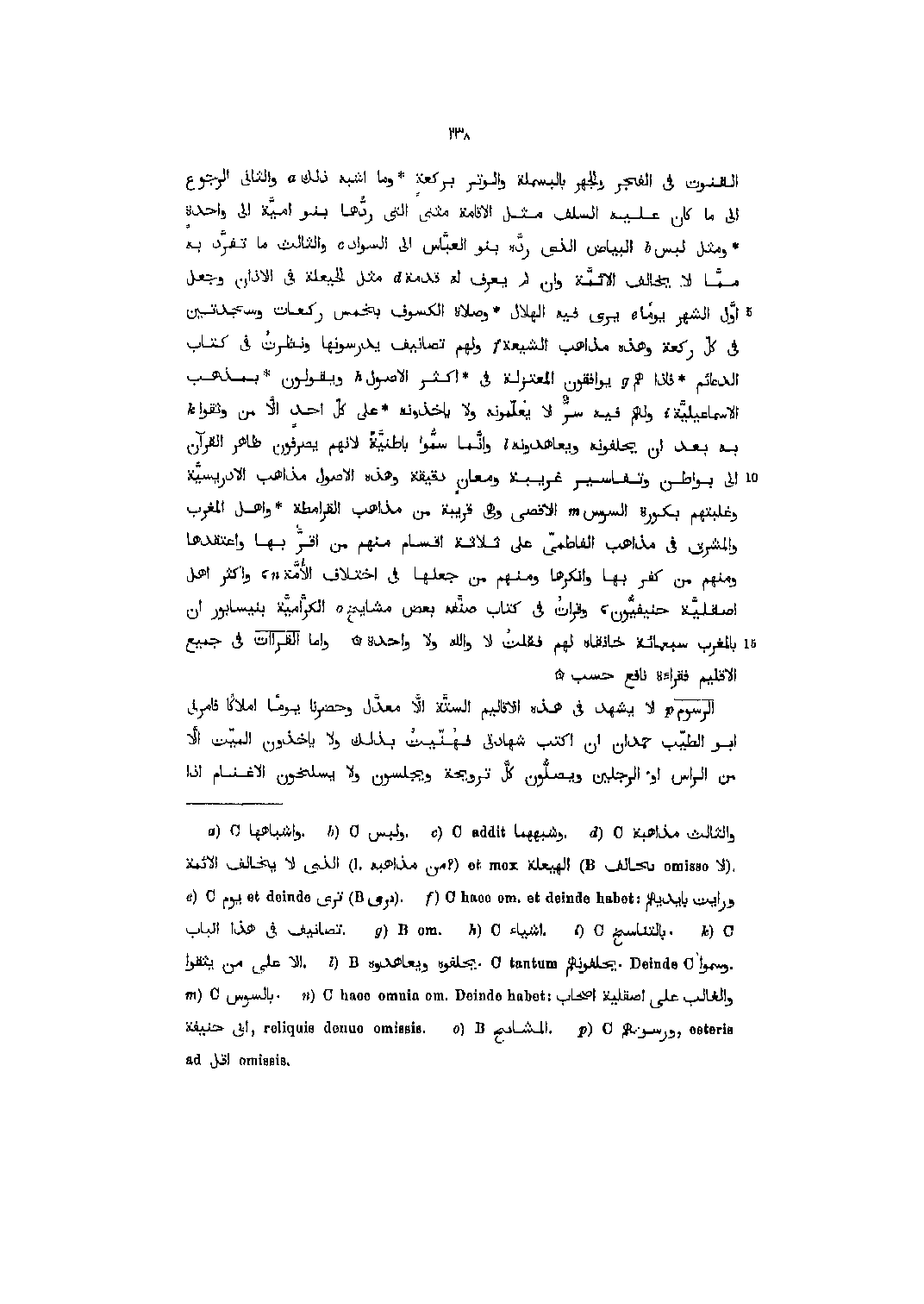 القنوت في الفجر والجهر بالبسملة والوتر بركعة وما أشبه ذلك [1] والثاني الرجوع الى ما كان عليه السلف مثل الاقامة مثنى التي ردّها بنو أميّة الى واحدة ومثل لبس [2] البياض الّذي ردّه بنو العبّاس الى السواد [3] والثالث ما تفرّد به ممّا لا يخالف الائمّة وان لم يعرف له قدمة [4] مثل الحيعلة في الأذان وجعل أوّل الشهر يوما [5] يرى فيه الهلال وصلاة الكسوف بخمس ركعات وسجدتين في كلّ ركعة وهذه مذاهب الشيعة [6] ولهم تصانيف يدرسونها ونظرت في كتاب الدعائم فإذا هم [7] يوافقون المعتزلة في أكثر الأصول [8] ويقولون بمذهب الإسماعيليّة [9] ولهم فيه سرّ لا يعلّمونه ولا يأخذونه على كلّ أحد الّا من وثقوا [10] به بعد ان يحلفونه ويعاهدونه [11] وانّما سمّوا باطنيّة لانهم يصرفون ظاهر القرآن الى بواطن وتفاسير غريبة ومعان دقيقة وهذه الأصول مذاهب الادريسيّة وغلبتهم بكورة السوس [12] الأقصى وهي قريبة من مذاهب القرامطة وأهل المغرب والمشرق في مذاهب الفاطمىّ على ثلاثة أقسام منهم من اقرّ بها واعتقدها ومنهم من كفر بها وأنكرها ومنهم من جعلها في اختلاف الأمّة [13] ، وأكثر أهل اصقليّة حنيفيّون، وقرأت في كتاب صنّفه بعض مشايخ [14] الكرّاميّة بنيسابور ان بالمغرب سبعمائة خانقاه لهم فقلت لا والله ولا واحدة واما؟ القراءات؟ في جميع الإقليم فقراءة نافع حسب الرسوم [15] لا يشهد في هذه الإقليم الستّة الّا معدّل وحضرنا يوما املاكا فأمرني ابو الطيّب حمدان ان اكتب شهادتي فهنّيت بذلك ولا يأخذون الميّت الّا من الرأس أو الرجلين ويصلّون كلّ ترويحة ويجلسون ولا يسلخون الأغنام إذا