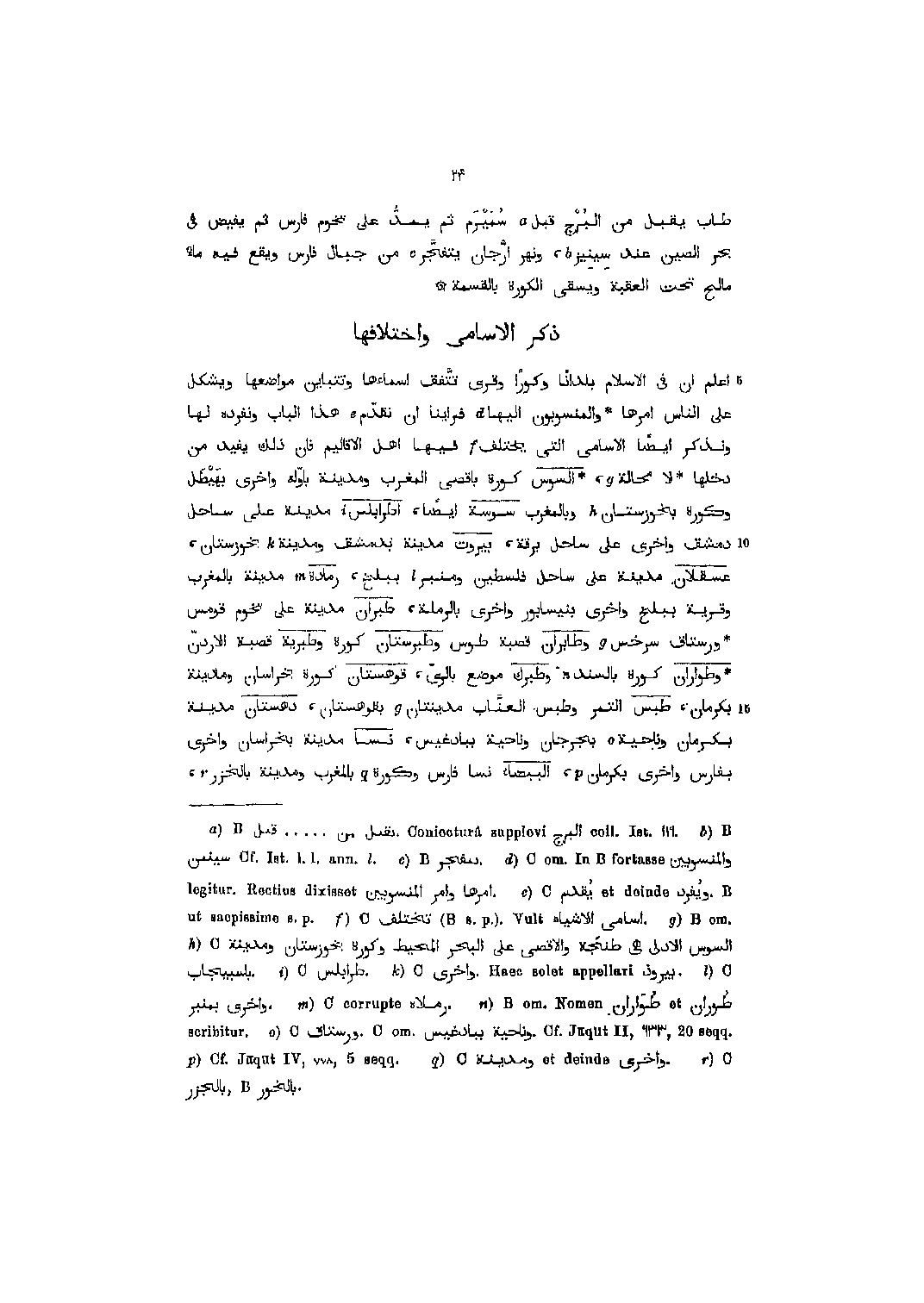 5 اعلم ان في الإسلام بلدانا وكورا وقرى تتّفق اسماءها وتتباين مواضعها ويشكل على الناس أمرها والمنسوبون اليها [4] فرأينا ان تقدّم [5] هذا الباب ونفرده لها ونذكر أيضا الأسامي التي يختلف [6] فيها أهل الأقاليم فان ذلك يفيد من دخلها لا محالة [7] ، السوس كورة بأقصى المغرب ومدينة بأوّله واخرى بهيطل وكورة بخوزستان [8] وبالمغرب سوسة أيضا، أطرابلس [9] مدينة على ساحل 10 دمشق واخرى على ساحل برقة، بيروت مدينة بدمشق ومدينة [10] بخوزستان، عسقلان مدينة على ساحل فلسطين ومنبر [11] ببلخ، ورمادة [12] مدينة بالمغرب وقرية ببلخ واخرى بنيسابور واخرى بالرملة، طبران مدينة على تخوم قومس ورستاق سرخس [7] وطابران قصبة طوس وطبرستان كورة وطبرية قصبة الاردنّ وطواران كورة بالسند [13] وطبرك موضع بالريّ، قوهستان كورة بخراسان ومدينة 15 بكرمان، طبس التمر وطبس العنّاب مدينتان [7] بقوهستان، دهستان مدينة بكرمان وناحية [14] بجرجان وناحية ببادغيس، نسا مدينة بخراسان واخرى بفارس واخرى بكرمان [15] ، البيضاء نسا فارس وكورة [16] بالمغرب ومدينة بالخزر [17] ،