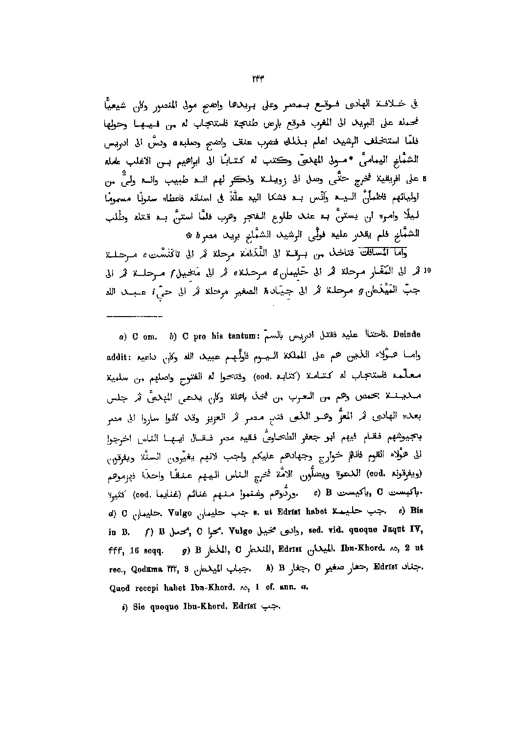 .Deinde [2] فاحتال عليه فقتل إدريس بالسمّ Cprohistantum:واما هؤلاء الذين هم على المملكة اليوم فاوّلهم عبيد الله وكان داعيه addit:معلّمه فاستجاب له كتامة (كتابه (cod.وفتحوا له الفتوح وأصلهم من سلمية مدينة. بحمص وهم من العرب من فخذ باهلة وكان يدعى المهدىّ ثم جلس بعده الهادي ثم المعزّ وهو الّذي فتح مصر ثم العزيز وقد كانوا ساروا الى مصر بجيوشهم فقام فيهم ابو جعفر الطحاوىّ فقيه مصر فقال ايها الناس اخرجوا الى هؤلاء القوم فإنهم خوارج وجهادهم عليكم واجب لانهم يغيّرون السنّة ويفرقون (ويفرقونه (cod.الدعوة ويضلّون الأمّة فخرج الناس اليهم عنقا واحدا فهزموهم. وردّوهم وغنموا منهم غنائم (غنائما (cod.كثيرة