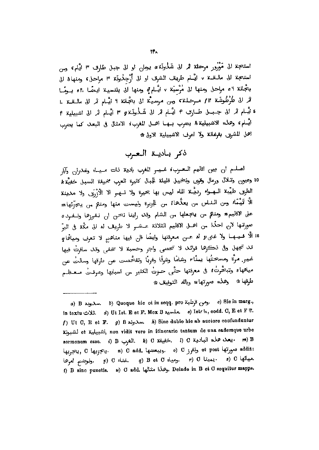 اعلم ان بين أقاليم العرب [9] غير المغرب بادية ذات مياه وغدران وآبار وعيون وتلال ورمال وقرى ونخيل قليلة الجبال كثيرة العرب مخيفة السبل خفيّة [10] الطرق طيّبة الهواء رديّة الماء ليس بها بحيرة ولا نهر الا الأزرق ولا مدينة الّا تيماء ومن الناس من يعدّها [11] من الجزيرة وليست منها ومنهم من يجزّئها [12] على الأقاليم [13] ومنهم من يجعلها من الشام وقد رأينا نحن ان نفرزها ونفرد [14] صورتها لان أحدا من أهل الأقاليم الثلاثة عشر لا طريق له الى مكّة في البرّ الّا فيها ولا غنى [15] له عن معرفتها وأيضا فان فيها مناهج لا تعرف ومياها [16] قد تجهل وفي ذكرها فوائد لا تحصى واجر وحسبة لا تخفى وقد سافرت فيها غير مرّة ومسحتها يمنا [17] وشاما وشرقا وغربا وتفحّصت عن طرقها وسالت عن مياهها [18] وتبحّرت [19] في معرفتها حتّى حزت الكثير من أسبابها وعرفت معظم طرقها وهذه صورتها [20] وباللَّه التوفيق
