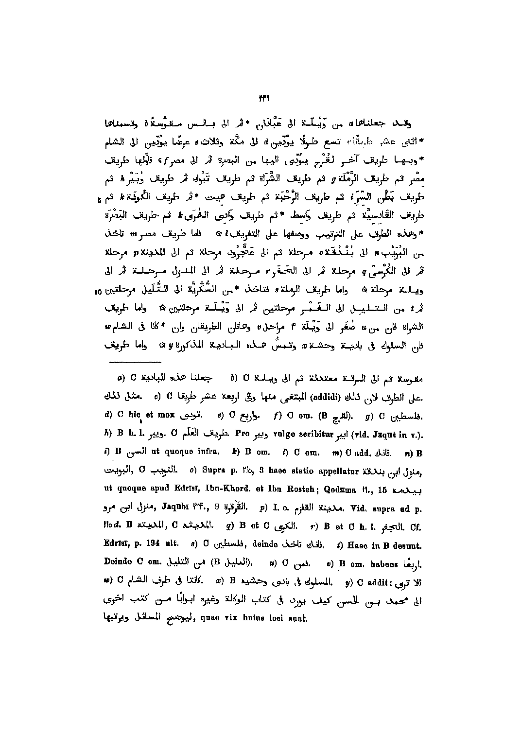 وقد جعلناها [1] من ويلة الى عبّادان ثم الى بالس مقوّسة [2] وقسمناها اثنى عشر طريقا [3] تسع طولا يؤدّين [4] الى مكّة وثلاث [5] عرضا يؤدّين الى الشام وبها طريق آخر لقرح يؤدّى اليها من البصرة ثم الى مصر [6] ، فاوّلها طريق مصر ثم طريق الرّملة [7] ثم طريق الشّراة ثم طريق تبوك ثم طريق وبير [8] ثم طريق بطن السّرّ [9] ثم طريق الرّحبة ثم طريق هيت ثم طريق الكوفة [10] ثم طريق القادسيّة ثم طريق واسط ثم طريق وادي القرى [10] ثم طريق البصرة وهذه الطرق على الترتيب ووصفها على التفريق [11] فاما طريق مصر [12] تأخذ من البويب [13] الى بندقة [14] مرحلة ثم الى عجرود مرحلة ثم الى المدينة [15] مرحلة ثم الى الكرسيّ [16] مرحلة ثم الى الحفر [17] مرحلة ثم الى المنزل مرحلة ثم الى ويلة مرحلة واما طريق الرملة [18] فتأخذ من السّكّريّة الى التّليل مرحلتين ثم [19] من التليل الى الغمر مرحلتين ثم الى ويلة مرحلتين واما طريق الشراة فان من [20] صغر الى ويلة 4 مراحل [21] وهاتان الطريقان وان كانا في الشام [22] فان السلوك في بادية وحشة [23] وتمس هذه البادية المذكورة [24] واما طريق