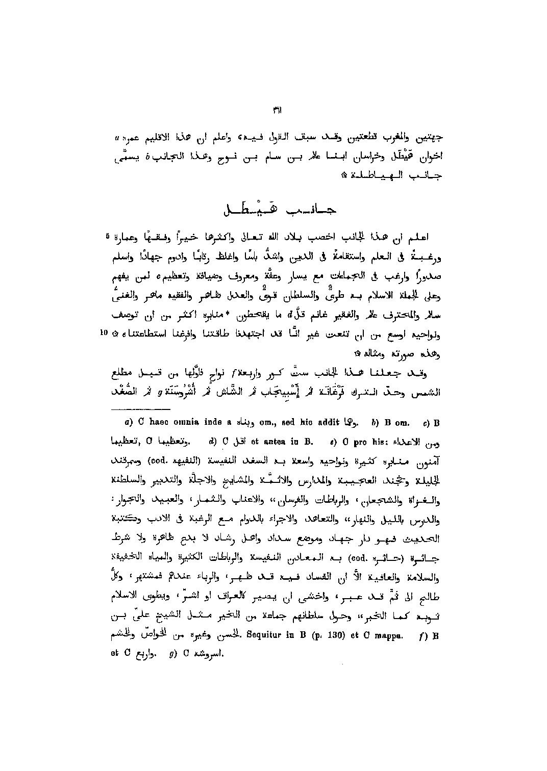 والدرس بالليل والنهار،، والتعاهد والاجراء بالدوام مع الرغبة في الأدب وكتبة الحديث فهو دار جهاد وموضع سداد وأهل رشاد لا بدع ظاهرة ولا شرط جائرة (حائرة (cod.به المعادن النفيسة والرباطات الكثيرة والمياه الخفيفة والسلامة والعافية الّا ان الفساد فيه قد ظهر، والربا عندهم فمشتهر، وكلّ طالح الى ثمّ قد عبر، وأخشى ان يصير كالعراق أو اشرّ، ويطوى الإسلام ثوبه كما الخبر،، وحول سلطانهم جماعة من الخير مثل الشيخ عليّ بن.SequiturinB (p.130) etCmappa.الحسن وغيره من الخواصّ والحشم