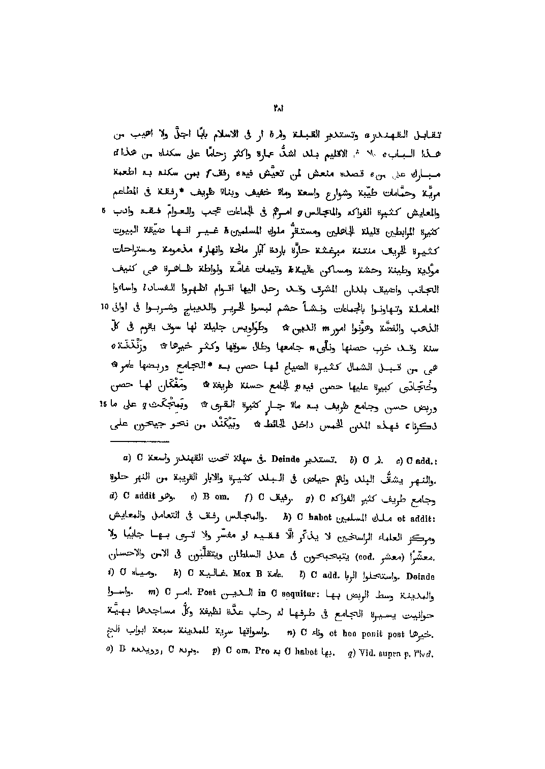 تقابل القهندز [1] وتستدبر القبلة ولم [2] أر في الإسلام بابا اجلّ ولا اهيب من هذا الباب [3] ولا في الإقليم بلد اشدّ عمارة وأكثر زحاما على سكناه من هذا [4] مبارك على من [5] قصده منعش لمن تعيّش فيه [5] رفق [6] بمن سكنه به اطعمة مريّة وحمّامات طيّبة وشوارع واسعة وماء خفيف وبناء ظريف رفقة في المطاعم والمعايش كثيرة الفواكه والمجالس [7] أمرهم في الجماعات عجب وللعوامّ فقه وأدب كثيرة المرابطين قليلة الجاهلين ومستقرّ ملوك المسلمين [8] غير انها ضيّقة البيوت كثيرة الحريق منتنة مبرغثة حارّة باردة آبار مالحة وانهار [9] مذمومة ومستراحات مؤذية وطينة وحشة ومساكن عالية [10] وتيمات غامّة ولواطة ظاهرة هي كنيف الجانب وأضيق بلدان المشرق وقد رحل اليها أقوام أظهروا الفساد [11] وأساءوا المعاملة وتهاونوا بالجماعات ونشأ حشم لبسوا الحرير والديباج وشربوا في أواني الذهب والفضّة وهوّنوا أمور [12] الدين وطواويس جليلة لها سوق يقوم في كلّ سنة وقد خرب حصنها و؟ نأى؟ [13] جامعها وطال سوقها وكثر خيرها وزندنة [14] هي من قبل الشمال كثيرة الضياع لها حصن به الجامع وربضها عامر وخجادى كبيرة عليها حصن فيه [15] الجامع حسنة ظريفة ومغكان لها حصن وربض حسن وجامع ظريف به ماء جار كثيرة القرى وبمجكث [16] على ما ذكرنا، فهذه المدن الخمس داخل الحائط وبيكند من نحو جيحون على