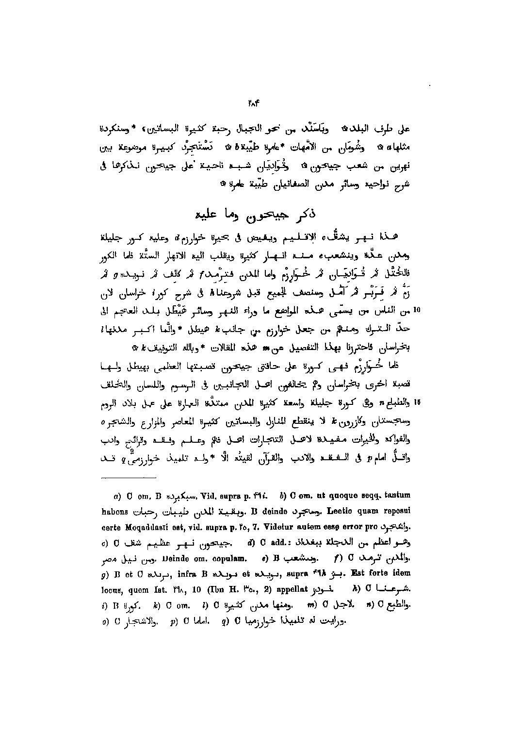 هذا نهر يشقّ [3] الإقليم ويفيض في بحيرة خوارزم [4] وعليه كور جليلة ومدن عدّة وينشعب [5] منه انهار كثيرة ويقلب اليه الأنهار الستّة فاما الكور فالختل ثم قواديان ثم خوارزم واما المدن فترمد [6] ثم كالف ثم نويده [7] ثم زمّ ثم فربر ثم آمل وسنصف الجميع قبل شروعنا [8] في شرح كور [9] خراسان لان من الناس من يسمّى هذه المواضع ما وراء النهر وسائر هيطل بلد العجم الى حدّ الترك ومنهم من جعل خوارزم من جانب [10] هيطل وانّما أكبر مدنها [11] بخراسان فاحترزنا بهذا التفصيل عن [12] هذه المقالات وباللَّه التوفيق [10] فاما خوارزم فهي كورة على حافتي جيحون قصبتها العظمى بهيطل ولها قصبة اخرى بخراسان وهم يخالفون أهل الجانبين في الرسوم واللسان والخلق والطباع [13] وهي كورة جليلة واسعة كثيرة المدن ممتدّة العمارة على عمل بلاد الروم وسجستان وكازرون [10] لا ينقطع المنازل والبساتين كثيرة المعاصر والمزارع والشجر [14] والفواكه والخيرات مفيدة لأهل التجارات أهل فهم وعلم وفقه وقرائح وأدب واقلّ امام [15] في الفقه والأدب والقرآن لقيته الّا وله تلميذ خوارزمىّ [16] قد