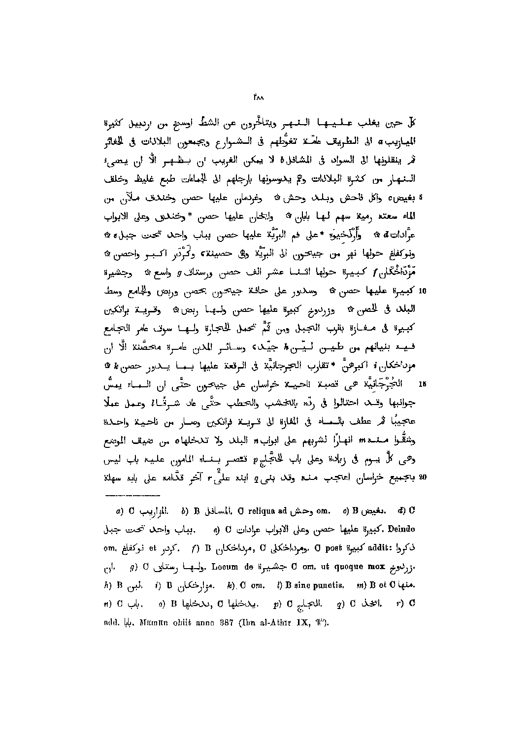 كلّ حين يغلب عليها النهر ويتأخّرون عن الشطّ اوسخ من أردبيل كثيرة الميازيب [1] الى الطريق عامّة تغوّطهم في الشوارع ويجمعون البلاذات في الحفائر ثم ينقلونها الى السواد في المشافل [2] لا يمكن الغريب ان يظهر الّا ان يضيء النهار من كثرة البلاذات وهم يدوسونها بأرجلهم الى الجماعات طبع غليظ وخلق بغيض [3] واكل فاحش وبلد وحش وغردمان عليها حصن وخندق ملآن من الماء سعته رمية سهم لها بابان وايخان عليها حصن وخندق وعلى الأبواب عرّادات [4] وأرذخيوه على فم البرّيّة عليها حصن بباب واحد تحت جبل [5] ونوكفاغ حولها نهر من جيحون الى البرّيّة وهي حصينة، وكردر أكبر وأحصن مزداخكان [6] كبيرة حولها اثنا عشر ألف حصن ورستاق [7] واسع وجشيرة كبيرة عليها حصن وسدور على حافة جيحون بحصن وربض والجامع وسط البلد في الحصن وزردوخ كبيرة عليها حصن ولها ربض وقرية براتكين كبيرة في مفازة بقرب الجبل ومن ثمّ تحمل الحجارة ولها سوق عامر الجامع فيه بنيانهم من طين ليّن [8] جيّد، وسائر المدن عامرة محصّنة الّا ان مزداخكان [9] أكبرهنّ تقارب الجرجانيّة في الرقعة عليها بما يدور حصن [10] الجرجانيّة هي قصبة ناحية خراسان على جيحون حتّى ان الماء يمسّ جوانبها وقد احتالوا في ردّه بالخشب والحطب حتّى عاد شرقا [11] وعمل عملا عجيبا ثم عطف بالماء في المفازة الى قرية فراتكين وصار من ناحية واحدة وشقّوا منه [12] أنهارا لشربهم على أبواب [13] البلد ولا تدخلها [14] من ضيق الموضع وهي كلّ يوم في زيادة وعلى باب الحجّاج [15] قصر بناه المأمون عليه باب ليس بجميع خراسان اعجب منه وقد بنى [16] ابنه عليّ [17] آخر قدّامه على بابه سهلة
