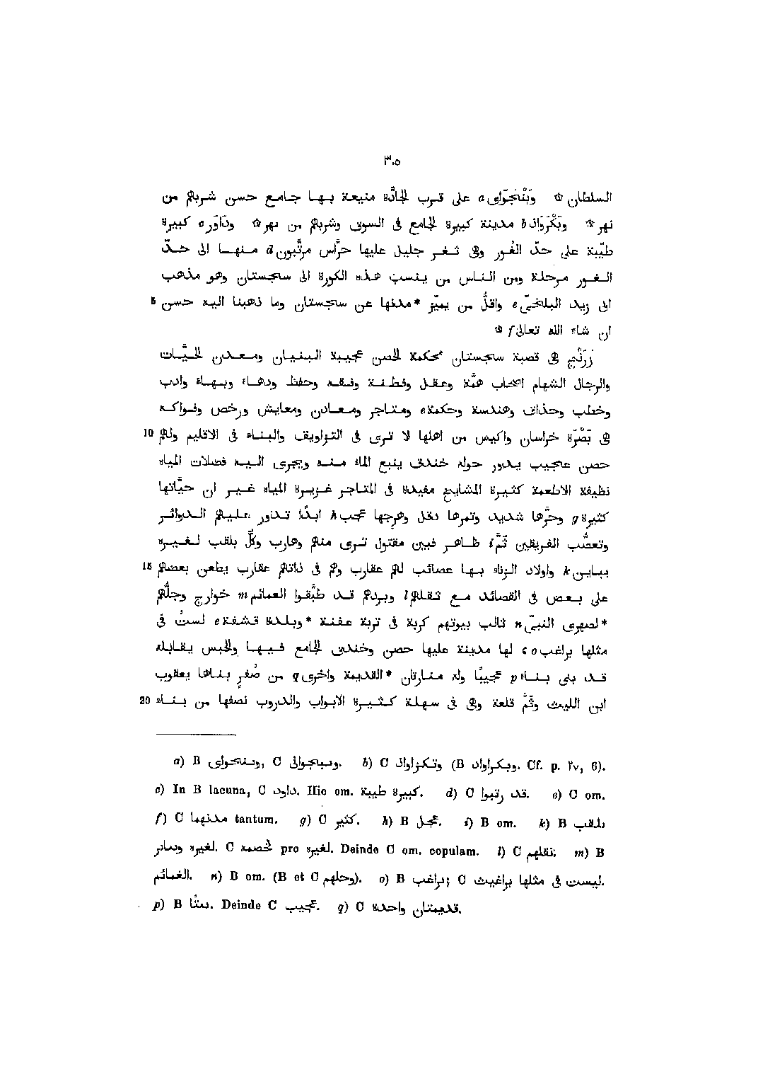 السلطان وبنجواى [1] على قرب الجادّة منيعة بها جامع حسن شربهم من نهر وبكرواذ [2] مدينة كبيرة الجامع في السوق وشربهم من نهر وداور [3] كبيرة طيّبة على حدّ الغور وهي ثغر جليل عليها حرّاس مرتّبون [4] منها الى حدّ الغور مرحلة ومن الناس من ينسب هذه الكورة الى سجستان وهو مذهب ابى زيد البلخيّ [5] واقلّ من يميّز مدنها عن سجستان وما ذهبنا اليه حسن ان شاء الله تعالى [6] زرنج هي قصبة سجستان محكمة الحصن عجيبة البنيان ومعدن الحيّات والرجال الشهام أصحاب همّة وعقل وفطنة وفقه وحفظ ودهاء وبهاء وأدب وخطب وحذاق وهندسة وحكمة [5] ومتاجر ومعادن ومعايش ورخص وفواكه هي بصرة خراسان وأكيس من أهلها لا ترى في التزاويق والبناء في الإقليم ولهم حصن عجيب يدور حوله خندق ينبع الماء منه ويجرى اليه فضلات المياه نظيفة الاطعمة كثيرة المشايخ مفيدة في المتاجر غزيرة المياه غير ان حيّاتها كثيرة [7] وحرّها شديد وتمرها دقل وهرجها عجب [8] ابدا تدور عليهم الدوائر وتعصّب الفريقين ثمّ [9] ظاهر فبين مقتول ترى منهم وهارب وكلّ بلقب لغيره يباين [10] وأولاد الزنا بها عصائب لهم عقارب وهم في ذاتهم عقارب يطعن بعضهم على بعض في القصائد مع ثقلهم [11] وبردهم قد طبّقوا العمائم [12] خوارج وجلّهم لصهرى النبيّ [13] ثالب بيوتهم كربة في تربة عفنة وبلدة قشفة [5] لست في مثلها براغب [14] ، لها مدينة عليها حصن وخندق الجامع فيها والحبس يقابله قد بنى بناء [15] عجيبا وله منارتان القديمة واخرى [16] من صفر بناها يعقوب ابن الليث وثمّ قلعة وهي في سهلة كثيرة الأبواب والدروب نصفها من بناء