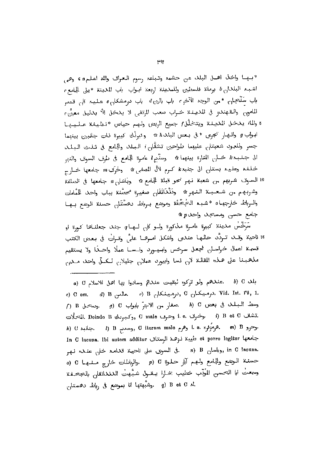 بها وأخذ أهل البلد عن حشمه وتباعه رسوم العراق والله اعلم [1] ، وهي أشبه البلدان [2] برملة فلسطين وللمدينة اربعة أبواب باب المدينة يلي الجامع [3] باب سنجان من الوجه الآخر [3] باب بالين [4] باب درمشكان [5] عليه كان قصر المأمون والقهندز في المدينة خراب صعب المرتقى لا يدخل الّا بدليل معيّن [3] والماء يدخل المدينة ويتخلّل [6] جميع الربض ولهم حياض نظيفة عليها أبواب [7] وانهار تجرى في بعض البلد [8] وكيرنك كبيرة ذات جانبين بينهما جسر وللعمود شعبتان عليهما طواحين تشقّان [9] البلد والجامع في ثلث البلد الى جنبه [10] خان المنارة بينهما وسنج [11] عامرة الجامع في طرف السوق والنهر خلفه وعليه بستان الى جنبه [10] كرم لآل المصفى وخرق [12] جامعها خارج السوق شربهم من شعبة نهر نحو قبلة الجامع وباشان [13] جامعها في الصاغة وشربهم من شعبة النهر ودندانقان صغيرة محصّنة بباب واحد الحمّامات والرباط خارجها [14] شبه الجحفة وموضع برباط دهستان حسنة الوضع بها جامع حسن ومسجد واحد [15] سرخس مدينة كبيرة عامرة مذكورة ولو كان لها [16] جند جعلناها كورة أو ناحية وقد تردّد حالها عندي وأشكل أمرها عليّ وقرأت في بعض الكتب قسمة اعمال خراسان فجعل سرخس وأبيورد ونسا عملا واحدا ولا يستقيم مذهبنا على هذه المقالة لان نسا وأبيورد عملان جليلان لكلّ واحد مدن