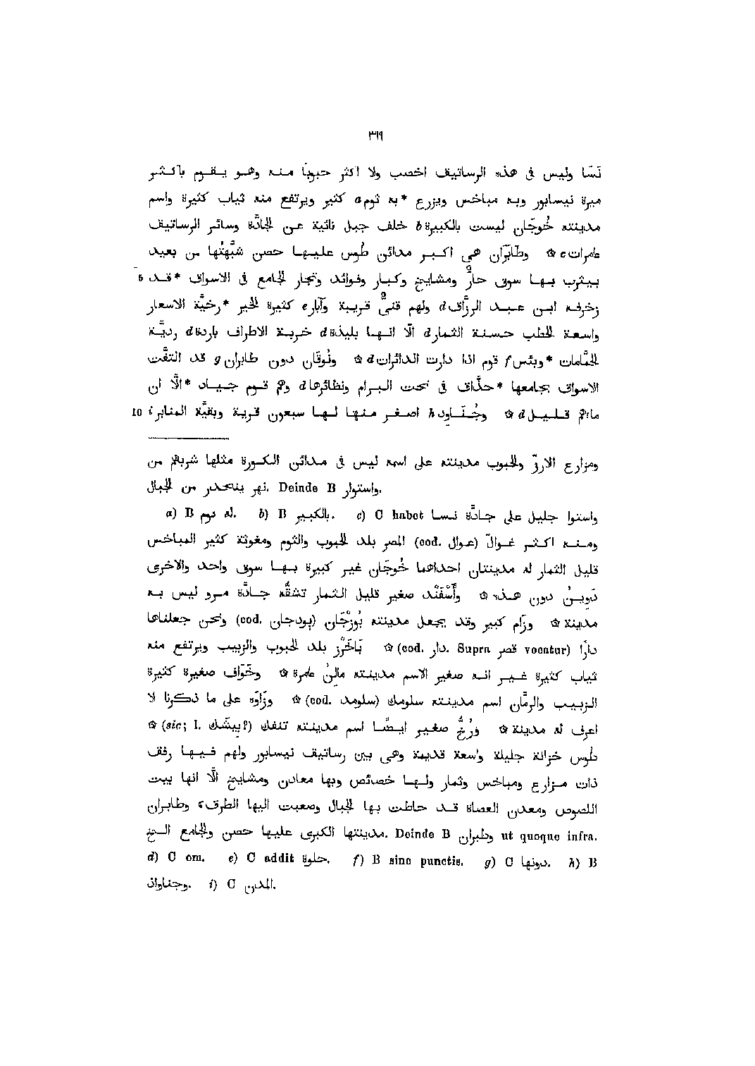 [3] واستوا جليل على جادّة نسا Chabet ومنه أكثر غوالّ (عوال (cod.المصر بلد الحبوب والثوم ومغوثة كثير المباخس قليل الثمار له مدينتان إحداهما خوجان غير كبيرة بها سوق واحد والأخرى دوين دون هذه وأسفند صغير قليل الثمار تشقّه جادّة مرو ليس به مدينة وزام كبير وقد يجعل مدينته بوزجان (بودجان (cod.ونحن جعلناها دارا vocatut) قصر.Supra دار (cod.باخرز بلد الحبوب والزبيب ويرتفع منه ثياب كثيرة غير انه صغير الاسم مدينته مالن عامرة وخواف صغيرة كثيرة الزبيب والرمّان اسم مدينته سلومك (سلومد (cod.وزاوه على ما ذكرنا لا اعرف له مدينة ورخّ صغير أيضا اسم مدينته تنفك (؟ بيشك (sic ;l.طوس خزانة جليلة وسعة قديمة وهي بين رساتيق نيسابور ولهم فيها رفق ذات مزارع ومباخس وثمار ولها خصائص وبها معادن ومشايخ الّا انها بيت اللصوص ومعدن العصاة قد حاطت بها الجبال وصعبت اليها الطرق، وطابران utquoqueinfra.وطبران.DeindeB مدينتها الكبرى عليها حصن والجامع إلخ
