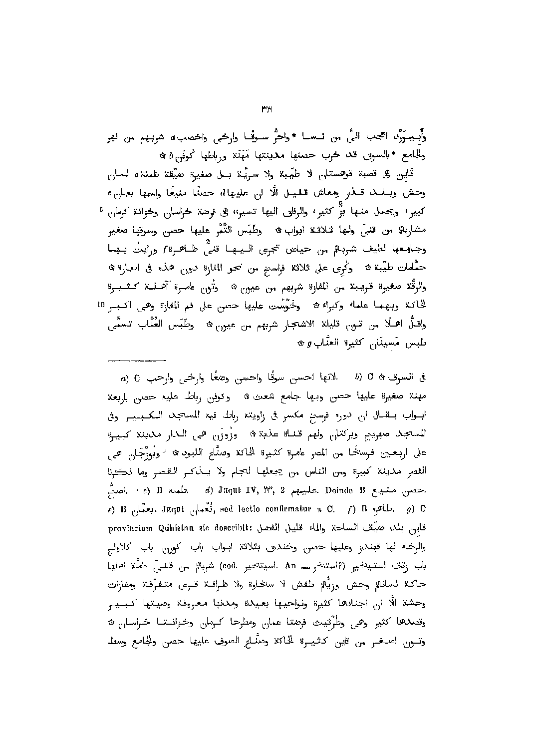 وأبيورد اعجب الىّ من نسا واحرّ سوقا وارخى وأخصب [1] شربهم من نهر والجامع بالسوق قد خرب حصنها مدينتها مهنة ورباطها كوفن [2] قاين هي قصبة قوهستان لا طيّبة ولا سريّة بل صغيرة ضيّقة ظمئة [3] لسان وحش وبلد قذر ومعاش قليل الّا ان عليها [4] حصنا منيعا واسمها بعمان [5] كبير، ويحمل منها بزّ كثير، والرفاق اليها تسير،، هي فرضة خراسان وخزانة كرمان مشاربهم من قنىّ ولها ثلاثة أبواب وطبس التّمر عليها حصن وسوقها صغير وجامعها لطيف شربهم من حياض تجرى اليها قنىّ ظاهرة ورأيت بها حمّامات طيّبة وكرى على ثلاثة فراسخ من نحو المفازة دون هذه في العمارة والرقّة صغيرة قريبة من المفازة شربهم من عيون وتون عامرة آهلة كثيرة الحاكة وبهما علماء وكبراء وخوست عليها حصن على فم المفازة وهي أكبر واقلّ أهلا من تون قليلة الأشجار شربهم من عيون وطبس العنّاب تسمّى طبس مسينان كثيرة العنّاب