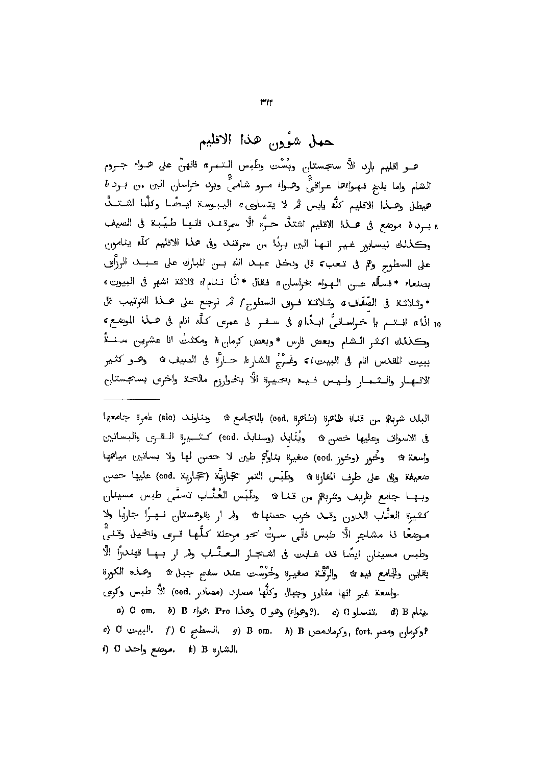 [ () ] البلد شربهم من قناة ظاهرة (طاهرة (cod.بالجامع دنباوند (sic) عامرة جامعها في الأسواق وعليها حصن وينابذ (وسنابذ (cod.كثيرة القرى والبساتين واسعة وخور (وخوز (cod.صغيرة بناؤهم طين لا حصن لها ولا بساتين مياهها ضعيفة وهي على طرف المفازة وطبس التمر حجازيّة (حجارية (cod.عليها حصن وبها جامع ظريف وشربهم من قنا وطبس العنّاب تسمّى طبس مسينان كثيرة العنّاب الدون وقد خرب حصنها ولم أر بقوهستان نهرا جاريا ولا موضعا ذا مشاجر الّا طبس فانّى سرت نحو مرحلة كلّها قرى ونخيل وقنىّ وطبس مسينان أيضا قد غابت في أشجار العنّاب ولم أر بها قهندزا الّا بقاين والجامع فيه والرّقة صغيرة وخوست عند سفح جبل وهذه الكورة. واسعة غير انها مفاوز وجبال وكلّها مصارد (مصادر (cod.الّا طبس وكرى