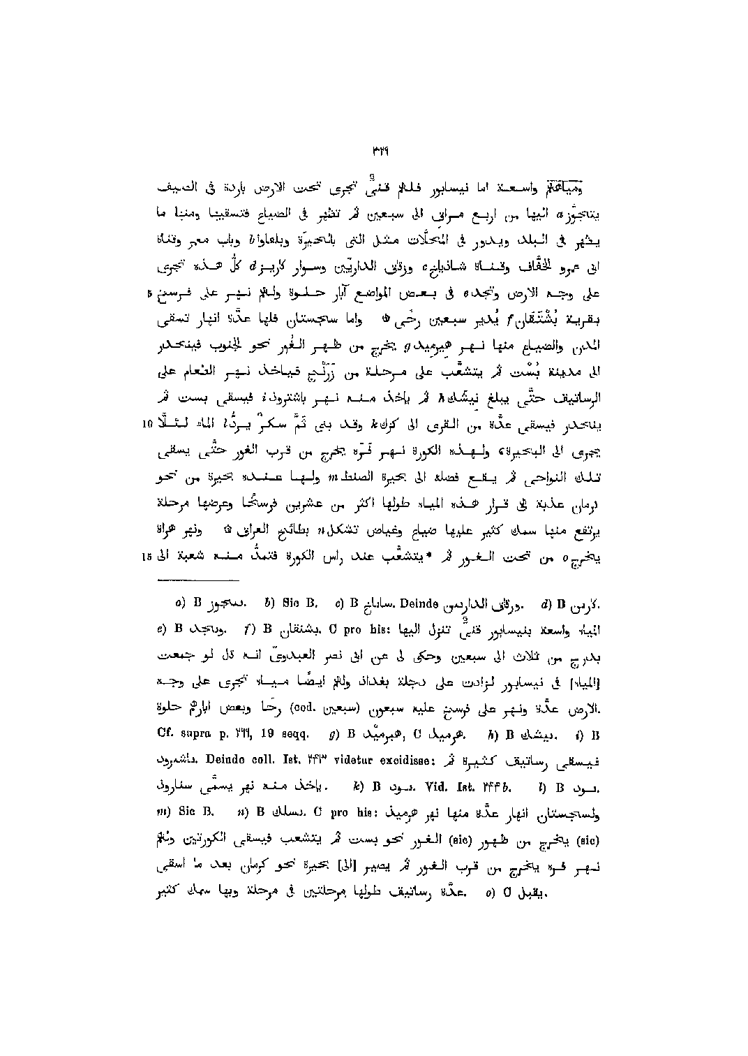 [6] المياه واسعة بنيسابور قنىّ تنزل اليها.Cprohis:بشتقان B بدرج من ثلاث الى سبعين وحكى لي عن ابى نصر العبدوىّ انه قال لو جمعت [المياه] في نيسابور لزادت على دجلة بغداذ ولهم أيضا مياه تجرى على وجه الأرض عدّة ونهر على فرسخ عليه سبعون (سبعين (cod.رحى وبعض آبارهم حلوةCf.suprap.269 ,19 seqq.