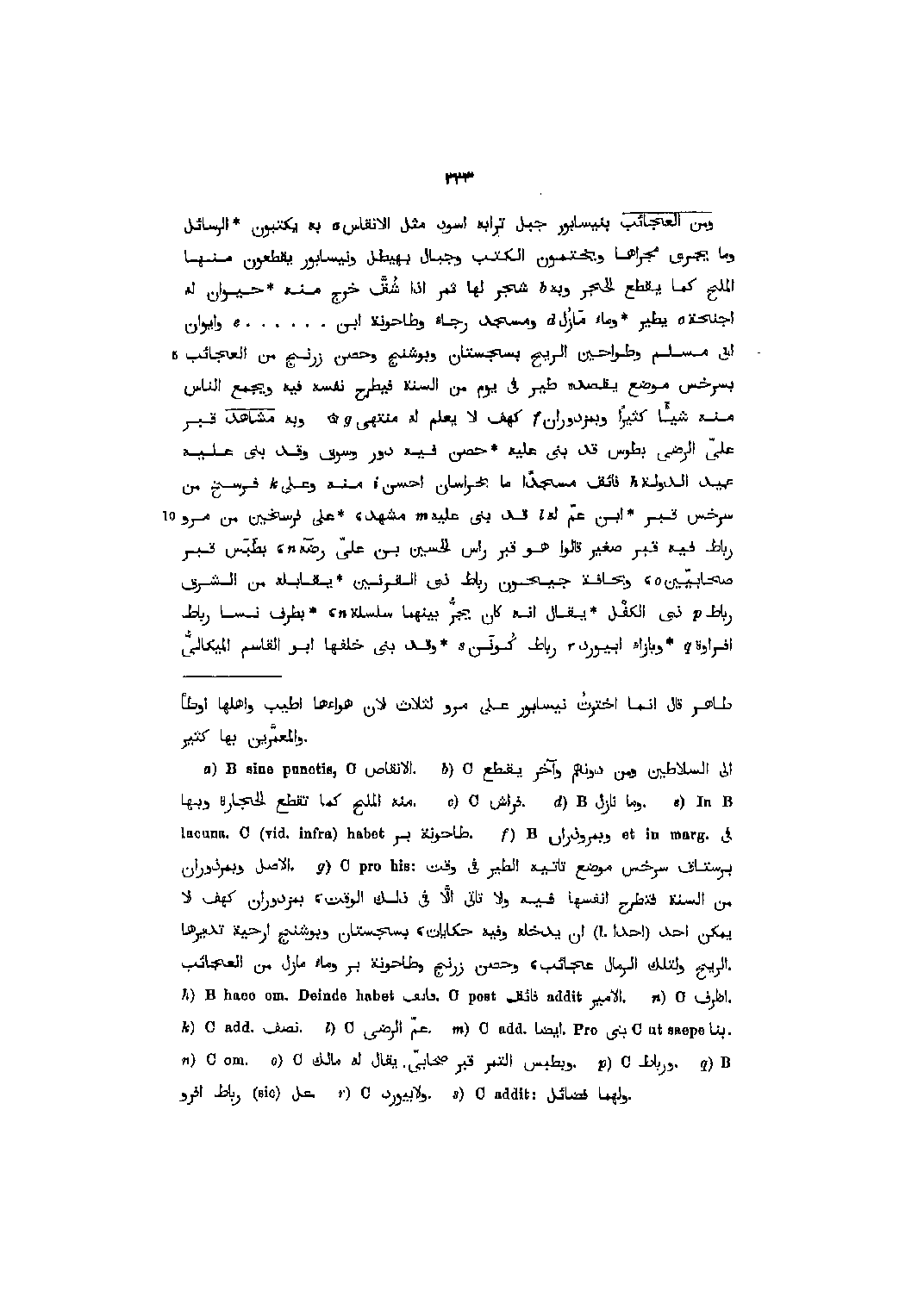 ومن العجائب بنيسابور جبل ترابه اسود مثل الانقاس [1] به يكتبون الرسائل وما يجرى مجراها ويختمون الكتب وجبال بهيطل ونيسابور يقطعون منها الملح كما يقطع الحجر وبه [2] شجر لها ثمر إذا شقّ خرج منه حيوان له اجنحة [3] يطير وماء مازل [4] ومسجد رجاء وطاحونة ابن ... [5] وايوان ابى مسلم وطواحين الريح بسجستان وبوشنج وحصن زرنج من العجائب بسرخس موضع يقصده طير في يوم من السنة فيطرح نفسه فيه ويجمع الناس منه شيئا كثيرا وبمزدوران [6] كهف لا يعلم له منتهى [7] وبه مشاهد قبر عليّ الرضى بطوس قد بنى عليه حصن فيه دور وسوق وقد بنى عليه عميد الدولة [8] فائق مسجدا ما بخراسان أحسن [9] منه وعلى [10] فرسخ من سرخس قبر ابن عمّ له [11] قد بنى عليه [12] مشهد، على فرسخين من مرو رباط فيه قبر صغير قالوا هو قبر راس الحسين بن عليّ رضي الله عنه [13] ، بطبس قبر صحابيّين [14] ، وبحافة جيحون رباط ذي القرنين يقابله من الشرق رباط [15] ذي الكفل يقال انه كان يجرّ بينهما سلسلة [13] ، بطرف نسا رباط افراوة [16] وبإزاء أبيورد [17] رباط كوفن [18] وقد بنى خلفها ابو القاسم الميكالىّ