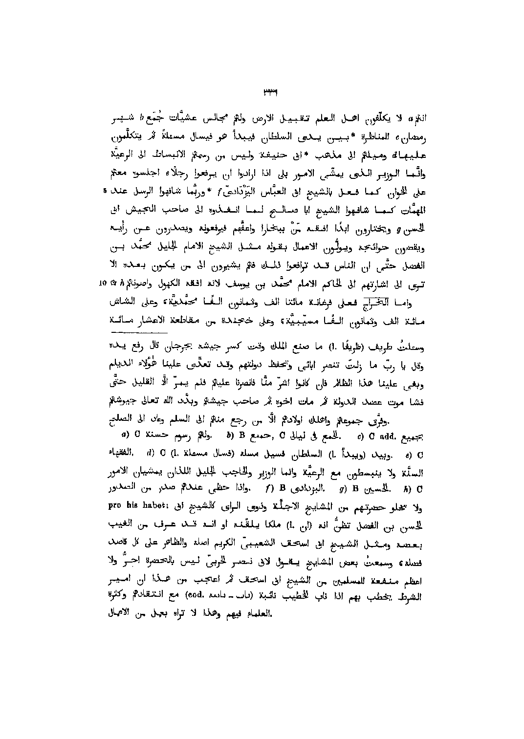 C [8] ولا تخلو حضرتهم من المشايخ الاجلّة وذوى الرأي كالشيخ ابى prohishabet:الحسن بن الفضل تظنّ انه (ان (l.ملكا يلقّنه أو انه قد عرف من الغيب بعضه ومثل الشيخ ابى إسحاق الشعيبيّ الكريم أصله والظاهر على كل قاصد فضله، وسمعت بعض المشايخ يقول لأبي نصر الحربىّ ليس بالحضرة اجرّ ولا أعظم منفعة للمسلمين من الشيخ ابى إسحاق ثم اعجب من هذا ان أمير الشرط يخطب بهم إذا ناب الخطيب نائبة (داب- دادمه (cod.مع انتقادهم وكثرة. العلماء فيهم وهذا لا تراه بعمل من الأعمال