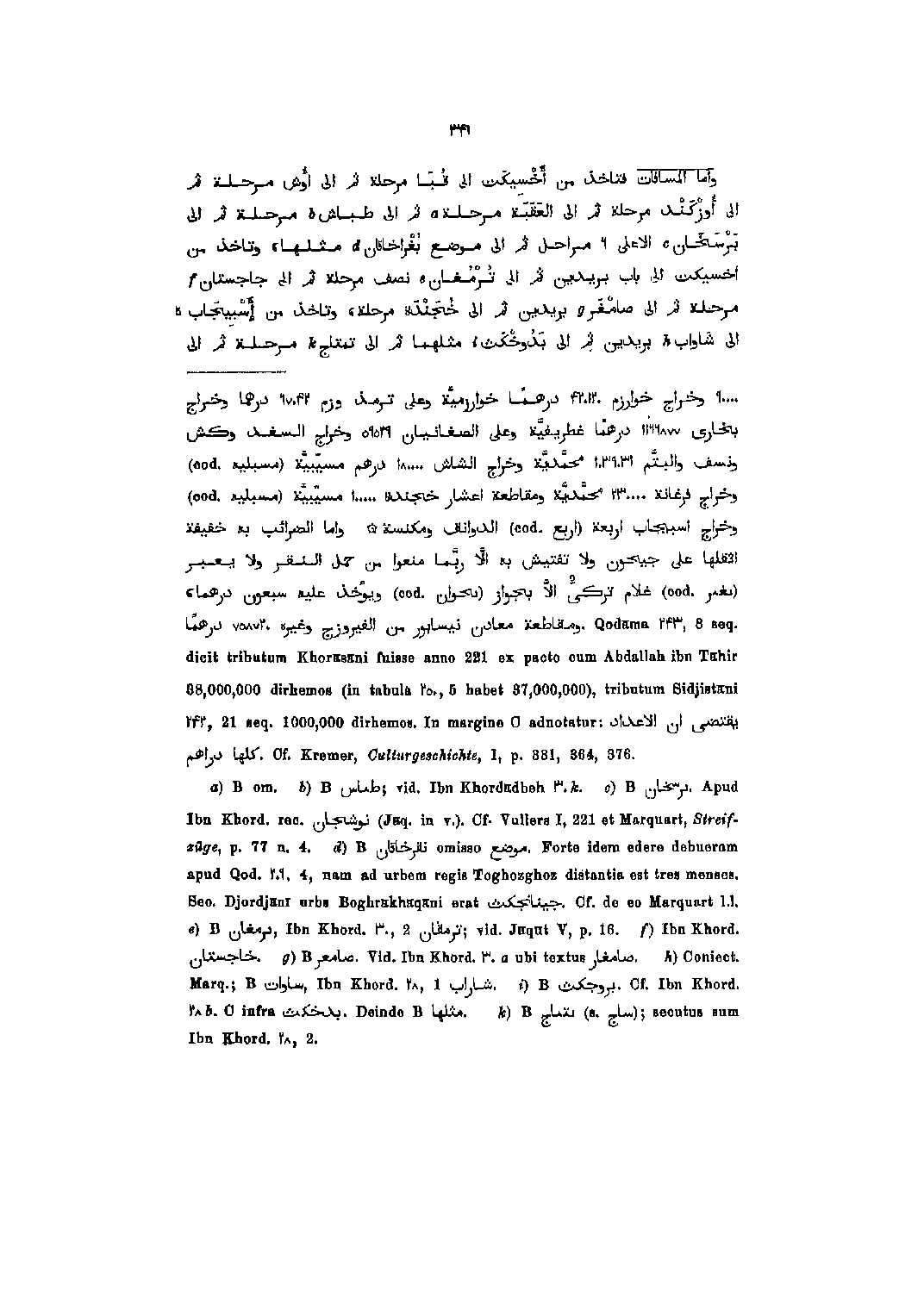 [ () ] 90000 وخراج خوارزم 420120 درهما خوارزميّة وعلى ترمذ وزم 67042 درهما وخراج بخارى 1166877 درهما غطريفيّة وعلى الصغانيان 59529 وخراج السغد وكش ونسف والبتّم 1039031 محمّديّة وخراج الشاش 180000 درهم مسيّبيّة (مسبليه (cod.وخراج فرغانة 230000 محمّديّة ومقاطعة أعشار خجندة 100000 مسيّبيّة (مسبلية (cod.وخراج أسبيجاب اربعة (اربع (cod.الدوانق ومكنسة واما الضرائب به خفيفة أثقلها على جيحون ولا تفتيش به الّا ربّما منعوا من حمل النقر ولا يعبر (؟ يغير (cod.؟ غلام تركىّ الّا بجواز (نحوان (cod.ويؤخذ عليه سبعون درهما.Qodama 243 ,8 seq.،ومقاطعة معادن نيسابور من الفيروزج وغيره 758720 درهما 38 ,000 ,000 dirhemos (intabula 250 ,5 habet 37 ,000 ,000) ,ibutumSidjistani rasanifuisseanno 221 AbdallahibnTahir يقتضي ان الاعداد.Cf.Kremer ,Culturgeschichte ,I ,p.331 ,364 ,376.242 ,21 seq.1000 ,000 dirhemos.argineCadnotatur:كلها دراهم