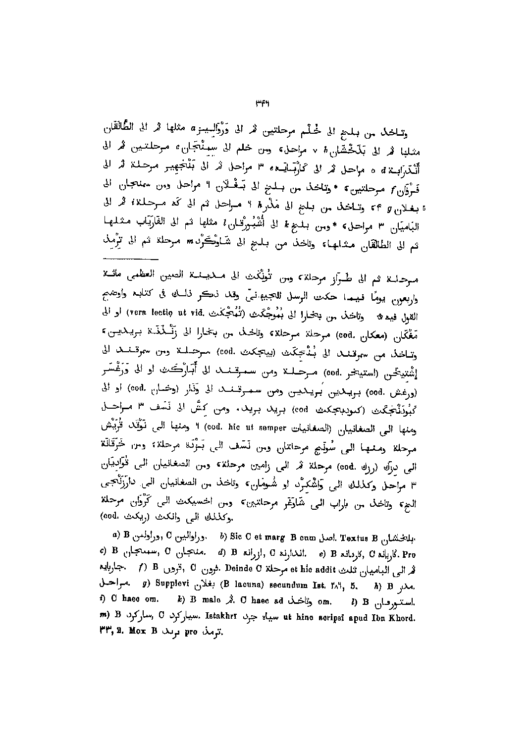 [ () ] مرحلة ثم الى طراز مرحلة، ومن تونكث الى مدينة الصين العظمى مائة وأربعون يوما فيما حكت الرسل للجيهانىّ وقد ذكر ذلك في كتابه وأوضح القول فيه وتأخذ من بخارا الى بموجكث (تمجكث (veralectioutvid.أو الى مغكان (معكان (cod.مرحلة مرحلة، وتأخذ من بخارا الى زنذنة بريدين، وتأخذ من سمرقند الى بنجكث (بيجكث (cod.مرحلة ومن سمرقند الى إشتيخن (استيخر (cod.مرحلة ومن سمرقند الى أباركث أو الى ورغسر (ورغش (cod.بريدين بريدين ومن سمرقند الى وذار (وخان (cod.أو الى كبودنجكث (كبودبجكث (cod.بريد بريد. ومن كشّ الى نسف 3 مراحل ومنها الى الصغانيان (الصغانيان 6 (cod.hicutsemper ومنها الى نوقد قريش مرحلة ومنها الى سونج مرحلتان ومن نسف الى بزده مرحلة، ومن خرقانة الى دزك (رزك (cod.مرحلة ثم الى زامين مرحلة، ومن الصغانيان الى قواديان 3 مراحل وكذلك الى واشكرد أو شومان، وتأخذ من الصغانيان الى دارزنجى إلخ، وتأخذ من باراب الى شاوغر مرحلتين، ومن اخسيكث الى كروان مرحلة. وكذلك الى وانكث (ريكث (cod.