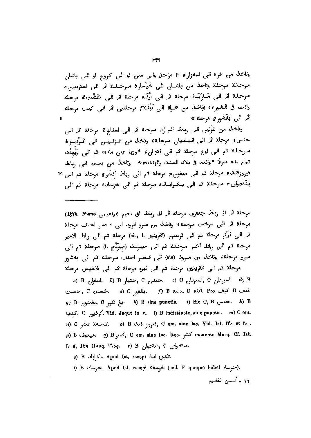 [ () ] مرحلة ثم الى رباط جعفري مرحلة ثم الى رباط ابى نعيم (بو نعيمي (DJih.Numa مرحلة ثم الى سرخس مرحلة، وتأخذ من مروالروذ الى قصر أحنف مرحلة ثم الى لوكر مرحلة ثم الى قرنيين (؟ قرينين (sic ,l.مرحلة ثم الى رباط الأمير مرحلة ثم الى رباط آخر مرحلة ثم الى حيرند (جيرنج (l.مرحلة ثم الى مرو مرحلة، وتأخذ من مروذ (sic) الى قصر أحنف مرحلة ثم الى بغشور. مرحلة ثم الى القريتين مرحلة ثم الى نبوه مرحلة ثم الى باذغيس مرحلة