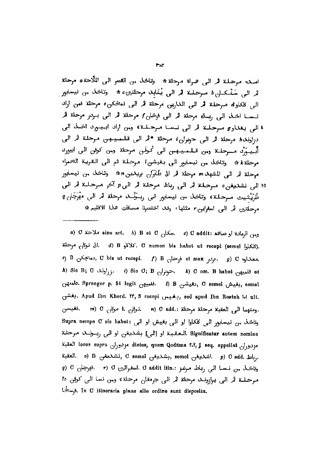 امده مرحلة ثم الى هراة مرحلة وتأخذ من القصر الى الملاحة [1] مرحلة ثم الى سنكان [2] مرحلة ثم الى ينابد مرحلتين [3] وتأخذ من نيسابور الى كلكاو [4] مرحلة ثم الى الدارين مرحلة ثم الى نمخكن [5] مرحلة ثم أراد نسا أخذ الى ريك مرحلة ثم الى فرخان [6] مرحلة ثم الى بردر مرحلة ثم الى بغداد [7] مرحلة ثم الى نسا مرحلة، ومن أراد أبيورد أخذ الى دزاوند [8] مرحلة ثم الى حويران [9] مرحلة ثم الى قلميهن مرحلة ثم الى أبيورد مرحلة ومن قلميهن الى كوفن مرحلة ومن كوفى الى أبيورد مرحلة [10] وتأخذ من نيسابور الى بغيشن [11] مرحلة ثم الى القرية الحمراء مرحلة ثم الى المشهد [12] مرحلة ثم الى طابران بريدين [13] وتأخذ من نيسابور الى نشديغن [14] مرحلة ثم الى رباط مرحلة ثم الى [15] آخر مرحلة ثم الى طريثيث مرحلة، وتأخذ من نيسابور الى ريوند مرحلة ثم الى مهرجان [16] مرحلتين ثم الى أسفراين [17] مثلها، وقد اختصرنا مسافات هذا الإقليم
