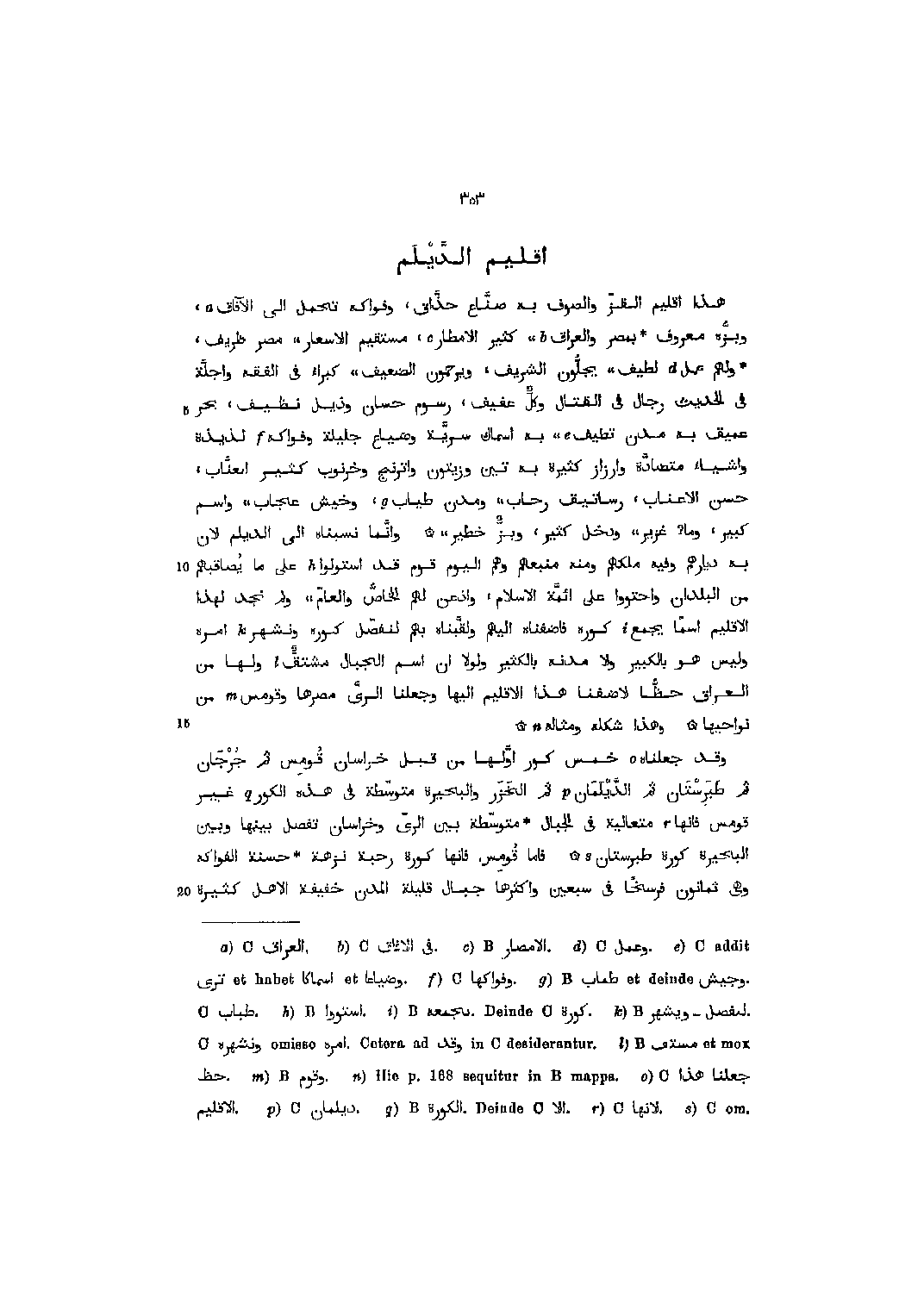 هذا إقليم القزّ والصوف به صنّاع حذّاق، وفواكه تحمل الى الآفاق [1] ، وبزّه معروف بمصر والعراق [2] ،، كثير الامطار [3] ، مستقيم الأسعار،، مصر ظريف، ولهم عمل [4] لطيف،، يجلّون الشريف، ويرحمون الضعيف،، كبراء في الفقه واجلّة في الحديث رجال في القتال وكلّ عفيف، رسوم حسان وذيل نظيف، بحرّ عميق به مدن تطيف [5] ،، به اسماك سريّة وضياع جليلة وفواكه [6] لذيذة وأشياء متضادّة وارزاز كثيرة به تين وزيتون واترنج وخرنوب كثير العنّاب، حسن الأعناب، رساتيق رحاب،، ومدن طياب [7] ، وخيش عجاب،، واسم كبير، وماء غزير،، ودخل كثير، وبزّ خطير،، وانّما نسبناه الى الديلم لان به ديارهم وفيه ملكهم ومنه منبعهم وهم اليوم قوم قد استولوا [8] على ما يصاقبهم من البلدان واحتووا على ائمّة الإسلام، وأذعن لهم الخاصّ والعامّ،، ولم نجد لهذا الإقليم اسما يجمع [9] كورة فاضفناه اليهم ولقّبناه بهم لنفصّل كورة ونشهر [10] امره وليس هو بالكبير ولا مدنه بالكثير ولولا ان اسم الجبال مشتقّ [11] ولها من العراق حظّا لاضفنا هذا الإقليم اليها وجعلنا الرىّ مصرها وقومس [12] من نواحيها وهذا شكله ومثاله [13] وقد جعلناه [14] خمس كور أوّلها من قبل خراسان قومس ثم جرجان ثم طبرستان ثم الدّيلمان [15] ثم الخزر والبحيرة متوسّطة في هذه الكور [16] غير قومس فإنها [17] متعالية في الجبال متوسّطة بين الرىّ وخراسان تفصل بينها وبين البحيرة كورة طبرستان [18] فاما قومس فإنها كورة رحبة نزهة حسنة الفواكه وهي ثمانون فرسخا في سبعين وأكثرها جبال قليلة المدن خفيفة الأهل كثيرة