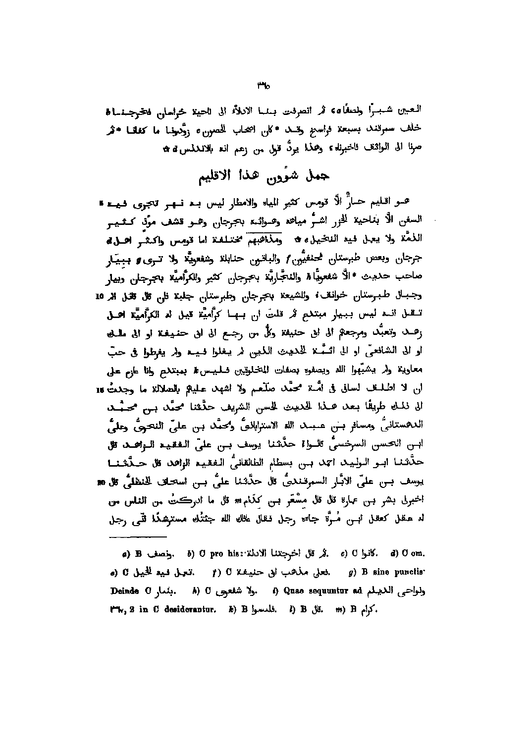 هو إقليم حارّ الّا قومس كثير المياه والامطار ليس به نهر تجرى فيه السفن الّا بناحية الخزر اشرّ مياهه وهوائه بجرجان وهو قشف مؤذ كثير الذمّة ولا يعمل فيه النخيل [5] ومذاهبهم مختلفة اما قومس وأكثر أهل [4] جرجان وبعض طبرستان فحنفيّون [6] والباقون حنابلة وشفعويّة ولا ترى [7] ببيار صاحب حديث الّا شفعويّا [8] والنجّاريّة بجرجان كثير وللكرّاميّة بجرجان وبيار وجبال طبرستان خوانق [9] وللشيعة بجرجان وطبرستان جلبة فان قال قائل ألم تقل انه ليس ببيار مبتدع ثم قلت ان بها كرّاميّة قيل له الكرّاميّة أهل زهد وتعبّد ومرجعهم الى ابى حنيفة وكلّ من رجع الى ابى حنيفة أو الى مالك أو الى الشافعيّ أو الى ائمّة الحديث الذين لم يغلوا فيه ولم يفرطوا في حبّ معاوية ولم يشبّهوا الله ويصفوه بصفات المخلوقين فليس [10] بمبتدع وانا عازم على ان لا أطلق لساني في امّة محمّد صلى الله عليه وسلم ولا اشهد عليهم بالضلالة ما وجدت الى ذلك طريقا بعد هذا الحديث الحسن الشريف حدّثنا محمّد بن محمّد الدهستانىّ ومسافر بن عبد الله الأستراباذيّ ومحمّد بن عليّ النحويّ وعليّ ابن الحسن السرخسىّ قالوا [11] حدّثنا يوسف بن عليّ الفقيه الزاهد قال حدّثنا ابو الوليد احمد بن بسطام الطالقانيّ الفقيه الزاهد قال حدّثنا يوسف بن عليّ الابّار السمرقندىّ قال حدّثنا عليّ بن إسحاق الحنظليّ قال أخبرني بشر بن عمارة قال قال مسعر بن كدام [12] قال ما أدركت من الناس من له عقل كعقل ابن مرّة جاءه رجل فقال عافاك الله جئتك مسترشدا انّى رجل