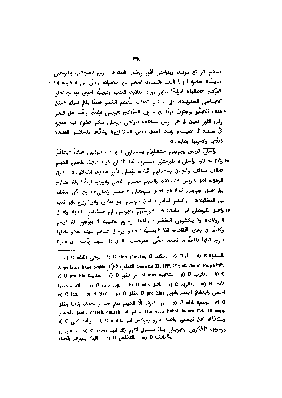 بسطام قبر ابى يزيد وبنواحي الخزر رباطات فاضلة ومن العجائب بطبرستان دويبّة صغيرة لها ألف قائمة [1] أصغر من الجرادة وأدقّ من الدودة إذا تحرّكت تختالها [2] امواجا تظهر من [3] عناقيد العنب ودويبّة اخرى لها جناحان كجناحى السنونية [4] على عظم الثعلب تقضم الثمار قضما ولهم اسماك مثل فلق الجمّيز واجتزت يوما في سوق السّماكين بجرجان فرأيت رأسا على قدر راس الثور فقيل لي هي راس سمكة [5] ، بنواحي جرجان بئر تظهر [6] فيه شجرة كلّ سنة ثم تغيب [7] وقد احتال بعض السلاطين [8] وشدّها بالسلاسل الغليظة ففكّتها وكسرتها وغابت ولسان قومس وجرجان متقاربان يستعملون الهاء يقولون هاده وهاكن وله [9] حلاوة ولسان [10] طبرستان مقارب له [11] الّا ان فيه عجلة ولسان الديلم مخالف منغلق والجيل يستعملون الخاء [12] ولسان الخزر شديد الانغلاق وفي ألوانهم [13] أهل قومس ابتلاء [14] والديلم حسان اللحى والوجوه أيضا ولهم طلل [15] وفي أهل جرجان نحافة [16] أهل طبرستان أحسن وأصفى [17] ، وفي الخزر مشابه من الصقالبة وأكثر أسامي [18] أهل جرجان ابو صادق وابو الربيع وابو نعيم وأهل طبرستان ابو حامد [19] ورسمهم بجرجان ان التذكير للفقهاء وأهل الروايات [20] ولا يكثرون التطالس [21] وللديلم رسوم عجيبة لا يزوّجون الى غيرهم وكنت في بعض الخانات [22] فإذا بصبيّة تعدو ورجل شاهر سيفه يعدو خلفها يروم قتلها فقلت ما فعلت حتّى استوجبت القتل قال انها زوّجت الى غيرنا