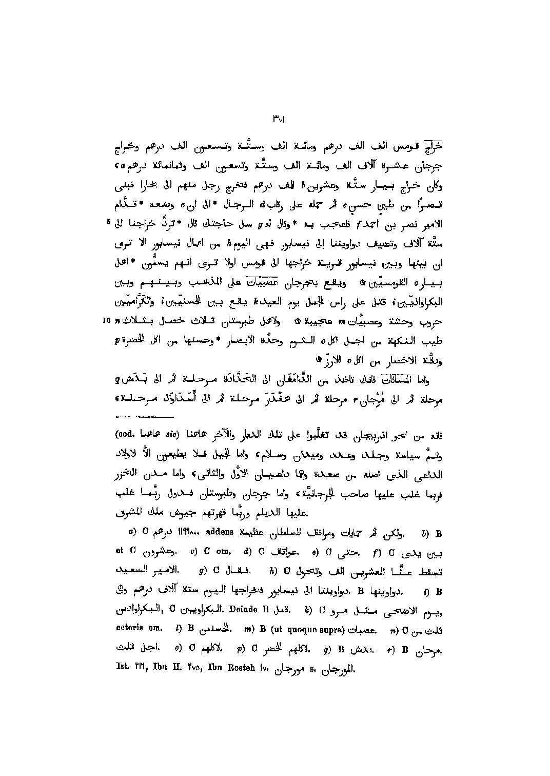 خراج قومس ألف ألف درهم ومائة ألف وستّة وتسعون ألف درهم وخراج جرجان عشرة آلاف ألف ومائة ألف وستّة وتسعون ألف وثمانمائة درهم [1] ، وكان خراج بيار ستّة وعشرين [2] ألف درهم فخرج رجل منهم الى بخارا فبنى قصرا من طين حسن [3] ثم حمله على رقاب [4] الرجال الى ان [5] وضعه قدّام الأمير نصر بن احمد [6] فأعجب به وقال له [7] سل حاجتك قال تردّ خراجنا الى ستّة آلاف وتضيف دواويننا الى نيسابور فهي اليوم [8] من اعمال نيسابور الا ترى ان بينها وبين نيسابور قرية خراجها الى قومس أولا ترى انهم يسمّون أهل بيار [3] القومسيّين ويقع بجرجان عصبيات على المذهب وبينهم وبين البكراواذيّين [9] قتل على راس الجمل يوم العيد [10] يقع بين الحسنيّين [11] والكرّاميّين حروب وحشة وعصبيّات [12] عجيبة ولأهل طبرستان ثلاث خصال بثلاث [13] طيب النكهة من أجل اكل [14] الثوم وحدّة الابصار وحسنها من اكل الخضرة [15] ودقّة الاخصار من اكل [14] الارزّ واما المسافات فإنك تأخذ من الدّامغان الى الحدّادة مرحلة ثم الى بدش [16] مرحلة ثم الى مرجان [17] مرحلة ثم الى هفدر مرحلة ثم الى أسداواذ مرحلة،