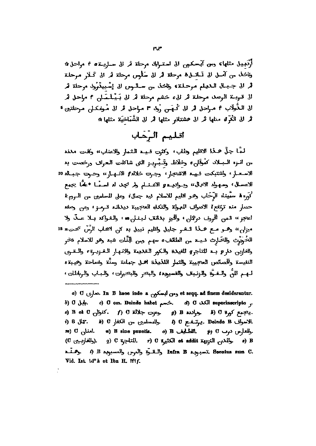لمّا جلّ هذا الإقليم وطاب، وكثرت فيه الثمار والأعناب،، وكانت مدنه من انزه البلاد كموقان [5] وخلاط وتبريز التي شاكلت العراق ورخصت به الأسعار، واشتبكت فيه الأشجار، وجرت خلاله [6] الأنهار،، وحوت جباله الاعسال، وسهوله الأعمال،، وبواديه [7] الأغنام ولم نجد له اسما عامّا يجمع كورة [8] سمّيناه الرّحاب وهو إقليم للإسلام فيه جمال [9] وعلى المسلمين من الروم [10] حصار منه ترتفع [11] الاصواف المعمولة والتكك العجيبة ديدانه قرمز، وعن وصفه أعجز،، ثمن الخروف درهمان، والخبز بدانق لبنان [12] ، والفواكه بلا عدّ ولا ميزان،، وهو مع هذا ثغر جليل وإقليم نبيل به كان أصحاب الرّسّ تحت [13] الحويرث والحارث فيه من الطائف [14] سهم ومن الجنّات شبه وهو للإسلام فخر وللغازين دار [15] به المتاجر [16] المفيدة والكور القديمة والأنهار الغزيرة [17] والقرى النفيسة والخصائص العجيبة والثمار اللذيذة أهل جماعة وسنّة وفصاحة وهيبة [18] لهم المنّ والفوّة والزنبق والقسبويه [19] والبحر والبحيرات، والباب والرباطات،
