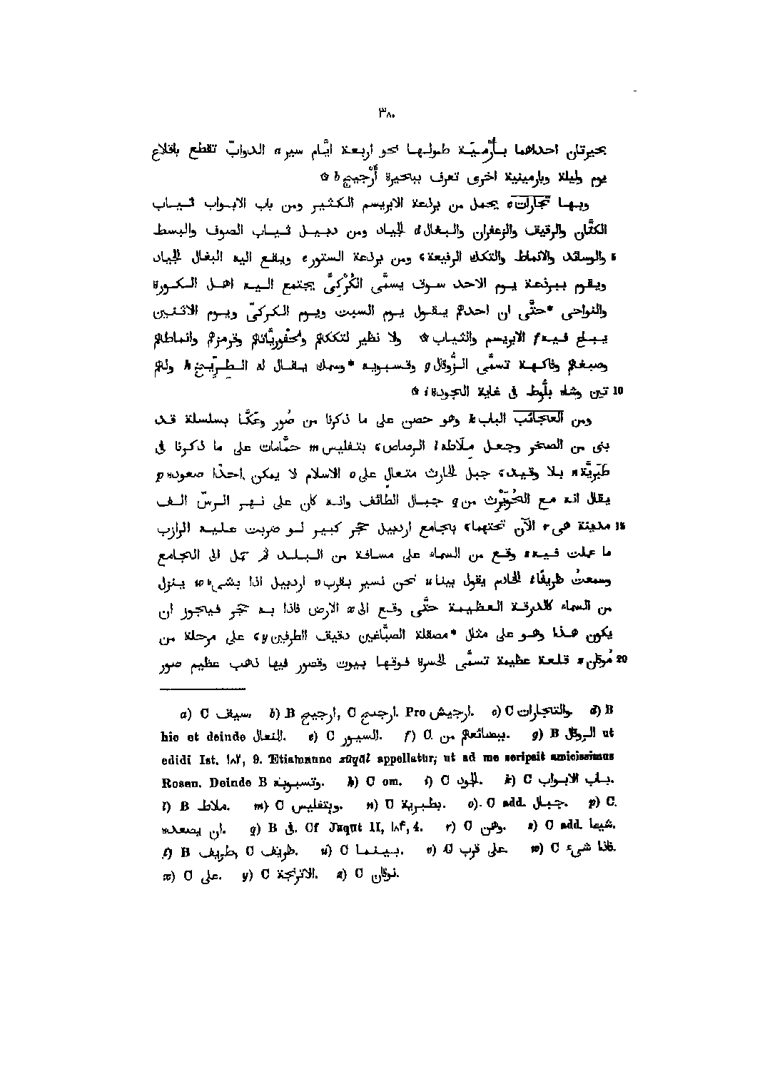 بحيرتان إحداهما بأرمية طولها نحو اربعة أيّام سير [1] الدوابّ تقطع باقلاع يوم وليلة وبارمينية اخرى تعرف ببحيرة أرجيح [2] وبها تجارات [3] يحمل من برذعة الإبريسم الكثير ومن باب الأبواب ثياب الكتّان والرقيق والزعفران والبغال [4] الجياد ومن دبيل ثياب الصوف والبسط والوسائد والأنماط والتكك الرفيعة، ومن برذعة الستور [5] ويقع اليه البغال الجياد ويقوم ببرذعة يوم الأحد سوق يسمّى الكركيّ يجتمع اليه أهل الكورة والنواحي حتّى ان أحدهم يقول يوم السبت ويوم الكركيّ ويوم الاثنين يباع فيه. [6] الإبريسم والثياب ولا نظير لتككهم ومحفوريّاتهم وقرمزهم وانماطهم وصبغهم وفاكهة تسمّى الزّوقال [7] وقسبويه وسمك يقال له الطرّيخ [8] ولهم تين وشاه بلّوط في غاية الجودة [9] ومن العجائب الباب [10] وهو حصن على ما ذكرنا من صور وعكّا بسلسلة قد بنى من الصخر وجعل ملاطه [11] الرصاص، بتفليس [12] حمّامات على ما ذكرنا في طبريّة [13] بلا وقيد، جبل الحارث متعال على [14] الإسلام لا يمكن أحدا صعوده [15] يقال انه مع الحويرث من [16] جبال الطائف وانه كان على نهر الرسّ ألف مدينة هي [17] الآن تحتهما، بجامع أردبيل حجر كبير لو ضربت عليه المرازب ما عملت فيه [18] وقع من السماء على مسافة من البلد ثم حمل الى الجامع وسمعت ظريفا [19] الخادم يقول بينا [20] نحن نسير بقرب [21] أردبيل إذا بشيء [22] ينزل من السماء كالدرقة العظيمة حتّى وقع الى [23] الأرض فإذا به حجر فيجوز ان يكون هذا وهو على مثال مصقلة الصبّاغين دقيق الطرفين [24] ، على مرحلة من موقان [25] قلعة عظيمة تسمّى الحسرة فوقها بيوت وقصور فيها ذهب عظيم صور