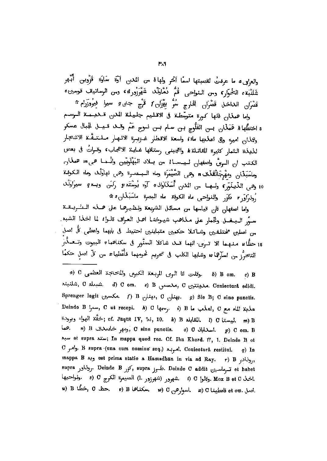 والعراق [1] ما عرفت لقصبتها اسما آخر ولها [2] من المدن آوه ساوة قزوين أبهر شلنبة [3] الخوار، ومن النواحي قمّ دماوند شهرزور [4] ، ومن الرساتيق قوسين [5] قصران الداخل قصران الخارج سرّ بهزان [6] قرج جنى [7] سيرا فيروزرام واما همذان فإنها كورة متوسّطة في الإقليم جليلة المدن قديمة الرسم اختطّها [8] همذان بن الفلّوج بن سام بن نوح عم وقد قيل الجبال عسكر وهمذان أميره وهي أعذبها ماء [9] واسعة الأقطار غزيرة الأنهار ملتفّة الأشجار لذيذة الثمار كثيرة المقاتلة [10] وأعجبني رستاقها غاية الاعجاب، وقرأت في بعض الكتب ان الرىّ وأصفهان ليسا [11] من بلاد البهلويّين وانّما هي [12] همذان وماسبذان ومهرجانقذق [13] وهي الصّيمرة وماه البصرة وهي نهاوند وماه الكوفة وهي الدّينور، ولها من المدن أسداواذ [14] آوه بوسته [15] رامن وبه [16] سيراوند روذراور [17] طرز والنواحي ماه الكوفة ماه البصرة ماسبذان [18] واما أصفهان فان قياسها من مسائل الشريعة ونظيرها على هذه الطريقة سؤر البغل والحمار على مذاهب شيوخنا أهل العراق قالوا [19] لما أخذا الشبه من اصلين مختلفين وشاكلا حكمين متباينين احتيط في بابهما واعطى كلّ أصل حظّا [20] منهما الا ترى انهما قد شاكلا السنّور في سكناهما [21] البيوت وتعذّر التحرّز من اسآرهما [22] وشابها الكلب في تحريم لحومهما فأعطيا [23] من كلّ أصل حكما