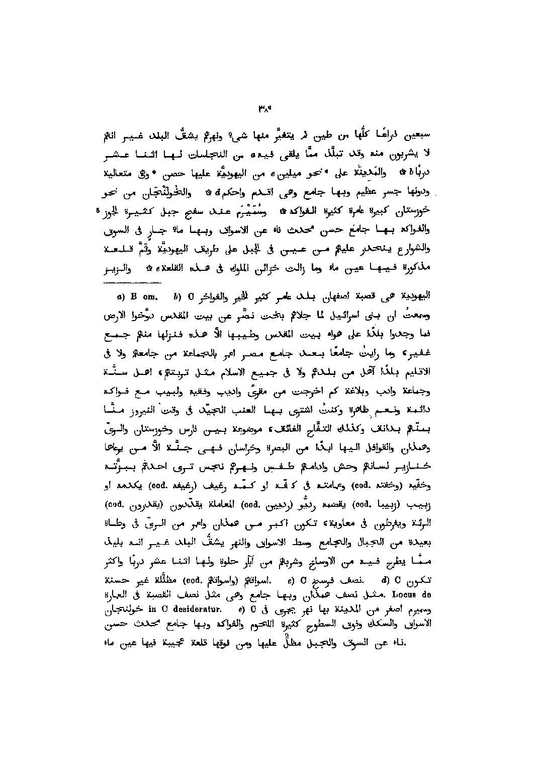 [2] اليهودية هي قصبة أصفهان بلد عامر كثير الخير والفواخر C وسمعت ان بنى إسرائيل لما جلاهم بخت نصّر عن بيت المقدس دوّخوا الأرض فما وجدوا بلدا على هواء بيت المقدس وطيبها الّا هذه فنزلها منهم جمع غفير، وما رأيت جامعا بعد جامع مصر اعمر بالجماعة من جامعهم ولا في الإقليم بلدا آهل من بلدهم ولا في جميع الإسلام مثل تربتهم، أهل سنّة وجماعة وأدب وبلاغة كم أخرجت من مقرئ واديب وفقيه ولبيب مع فواكه دائمة ونعم ظاهرة وكنت اشترى بها العنب الجيّد في وقت النيروز منّا بمنّهم بدانق وكذلك التفّاح الفائق، موضوعة بين فارس وخوزستان والرىّ وهمذان والقوافل اليها ابدا من البصرة وخراسان فهي جنّة الّا من يرعاها خنازير لسانهم وحش وادامهم طفس ونهرهم نجس ترى أحدهم ببزّته وخفيّه (وخفته (cod.وعمامته في كفّه أو كمّه رغيف (رغيفه (cod.يكدمه أو زبيب (زبيبا (cod.يقضمه رديّو (رديين (cod.المعاملة يقدّدون (يقدرون (cod.الرئة ويفرطون في معاوية، تكون أكبر من همذان واعمر من الرىّ في وطاة بعيدة من الجبال والجامع وسط الأسواق والنهر يشقّ البلد غير انه بليذ ممّا يطرح فيه من الأوساخ وشربهم من آبار حلوة ولها اثنا عشر دربا وأكثر. أسواقهم (وأسواقهم (cod.مظلّلة غير حسنة