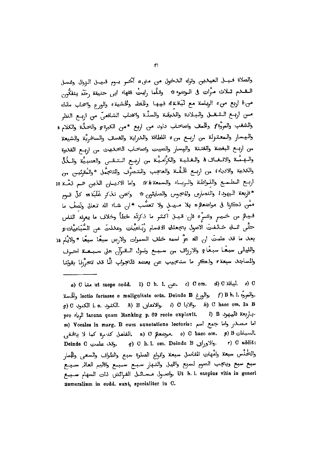 والصلاة قبل العيدين وترك الدخول من منى [1] آخر يوم قبل الزوال وغسل القدم ثلاث مرّات في الوضوء وقلّما رأيت فقهاء ابى حنيفة رحمه الله ينفكّون من [2] اربع من [3] الرئاسة مع لباقة [4] فيها والحفظ والخشية [5] والورع وأصحاب مالك من اربع الثقل والبلادة والديانة والسنّة وأصحاب الشافعيّ من اربع النضر والشغب والمروّة [6] والحمق وأصحاب داود من اربع من الكبرة [7] والحدّة والكلام 5 واليسار والمعتزلة من اربع من [3] الطاقة والدراية والفسق والسخريّة والشيعة من اربع البغضة والفتنة واليسار والصيت وأصحاب الحديث من اربع القدوة والهمّة والإنفاق [8] والغلبة والكرّاميّة من اربع التقى والعصبيّة والذلّ والكدية والأدباء [9] من اربع الخفّة والعجب والتصرّف والتجمّل والمقرءين من اربع الطمع واللواطة والرياء والسمعة [10] واما الأديان الذين هم ذمّة 10 فأربعة اليهود [11] والنصارى والمجوس والصابئون ونحن نذكر غلبة [12] كلّ قوم ممّن ذكرنا في مواضعهم [13] بلا ميل ولا تعصّب ان شاء الله تعالى ونصف ما فيهم من خير وشرّ [14] فان قيل أكثر ما ذكرته خطأ وخلاف ما يعرفه الناس حتّى انك خالفت الأصول بجعلك الأقسام رباعيّات وعدلت عن السّباعيّات [15] بعد ما قد علمت ان الله عزّ اسمه خلق السموات والأرض سبعا سبعا والأيّام 15 والليالي سبعا سبعا [16] والأرزاق من سبع ونزل القرآن على سبعة أحرف والمساجد سبعة [17] وذكر ما سنجيب عن بعضه فالجواب انّا قد تحرّزنا بقولنا