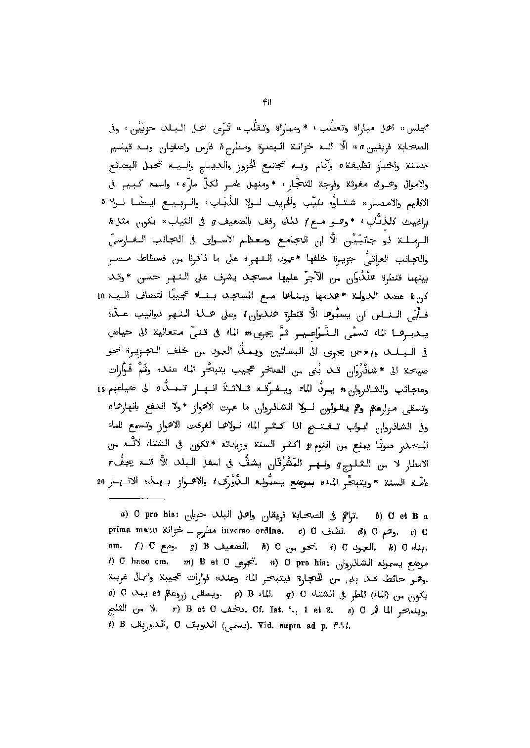 مجلس،، أهل مباراة وتعصّب، ومماراة وتقلّب،، ترى أهل البلد حزبين، وفي الصحابة فريقين [1] ،، الّا انه خزانة البصرة ومطرح [2] فارس وأصفهان وبه قياسير حسنة واخباز نظيفة [3] وآدام وبه تجتمع الخزوز والديباج واليه تحمل البضائع والأموال وهو [4] مغوثة وفرجة للتجّار، ومنهل عامر لكلّ مارّ [5] ، واسمه كبير في الأقاليم والأمصار،، شتاؤه طيّب والخريف لولا الذباب، والربيع أيضا لولا براغيث كالذئاب، وهو مع [6] ذلك رفق بالضعيف [7] في الثياب،، يكون مثل [8] الرملة ذو جانبين الّا ان الجامع ومعظم الأسواق في الجانب الفارسىّ والجانب العراقىّ جزيرة خلفها عمود النهر [9] على ما ذكرنا من فسطاط مصر بينهما قنطرة هندوان من الآجرّ عليها مسجد يشرف على النهر حسن وقد كان [10] عضد الدولة هدمها وبناها مع المسجد بناء عجيبا لتضاف اليه فأبى الناس ان يسمّوها الّا قنطرة هندوان [11] وعلى هذا النهر دواليب عدّة يديرها الماء تسمّى النّواعير ثمّ يجرى [12] الماء في قنىّ متعالية الى حياض في البلد وبعض يجرى الى البساتين ويمدّ العمود من خلف الجزيرة نحو صيحة الى شاذروان قد بنى من الصخر عجيب يتبحّر الماء عنده وثمّ فوّارات وعجائب والشاذروان [13] يردّ الماء ويفرّقه ثلاثة انهار تمدّ [14] الى ضياعهم وتسقى مزارعهم وهم يقولون لولا الشاذروان ما عمرت الأهواز ولا انتفع بانهارها [5] وفي الشاذروان أبواب تفتح إذا كثر الماء لولاها لغرقت الأهواز وتسمع للماء المنحدر صوتا يمنع من النوم [15] أكثر السنة وزيادته تكون في الشتاء لانّه من الامطار لا من الثلوج [16] ونهر المشرقان يشقّ في أسفل البلد الّا انه يجفّ [17] عامّة السنة ويتبحّر الماء [18] بموضع يسمّونه الدّورق [19] والأهواز بهذه الأنهار
