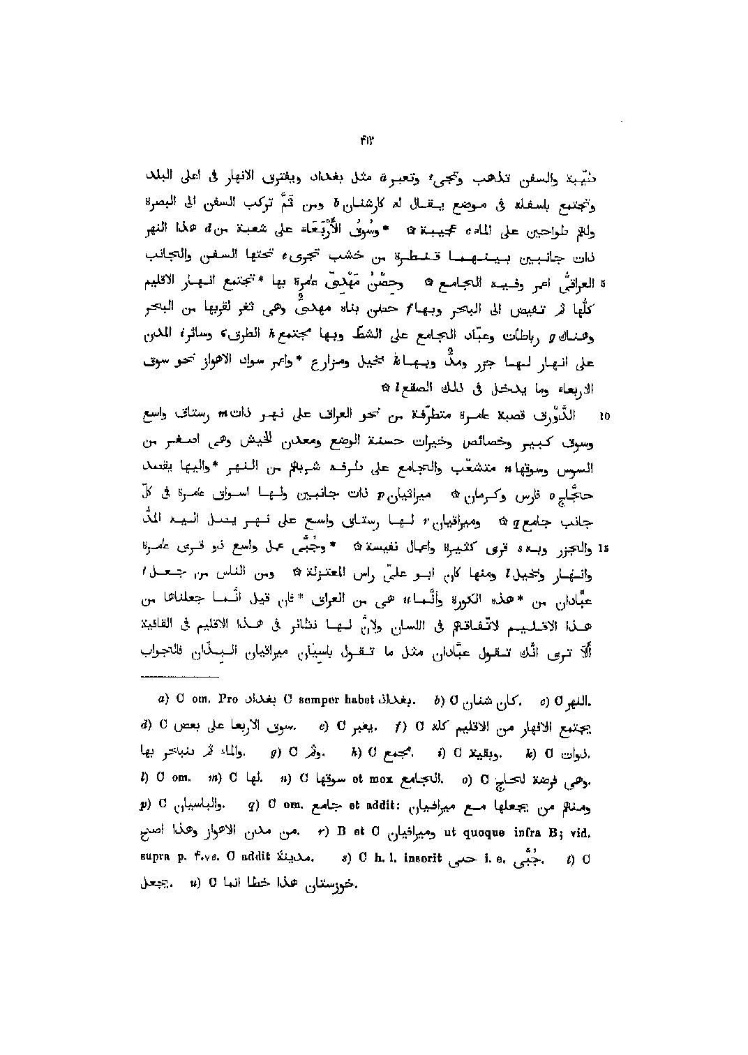 طيّبة والسفن تذهب وتجيء وتعبر [1] مثل بغداد ويفترق الأنهار في أعلى البلد وتجتمع بأسفله في موضع يقال له كارشنان [2] ومن ثمّ تركب السفن الى البصرة ولهم طواحين على الماء [3] عجيبة وسوق الأربعاء على شعبة من [4] هذا النهر ذات جانبين بينهما قنطرة من خشب تجرى [5] تحتها السفن والجانب العراقىّ اعمر وفيه الجامع وحصن مهدىّ عامرة بها تجتمع انهار الإقليم كلّها ثم تفيض الى البحر وبها [6] حصن بناه مهدىّ وهي ثغر لقربها من البحر وهناك [7] رباطات وعبّاد الجامع على الشطّ وبها مجتمع [8] الطرق، وسائر [9] المدن على انهار لها جزر ومدّ وبها [10] نخيل ومزارع واعمر سواد الأهواز نحو سوق الأربعاء وما يدخل في ذلك الصقع [11] الدّورق قصبة عامرة متطرّفة من نحو العراق على نهر ذات [12] رستاق واسع وسوق كبير وخصائص وخيرات حسنة الوضع ومعدن الخيش وهي أصغر من السوس وسوقها [13] متشعّب والجامع على طرفه شربهم من النهر واليها يقصد حجّاج [14] فارس وكرمان ميراثيان [15] ذات جانبين ولها أسواق عامرة في كلّ جانب جامع [16] وميراقيان [17] لها رستاق واسع على نهر يصل اليه المدّ والجزر وبه [18] قرى كثيرة واعمال نفيسة وجبّى عمل واسع ذو قرى عامرة وانهار ونخيل [11] ومنها كان ابو عليّ رأس المعتزلة ومن الناس من جعل [19] عبّادان من هذه الكورة وانّما [20] هي من العراق فان قيل انّما جعلناها من هذا الإقليم لاتّفاقهم في اللسان ولأنّ لها نظائر في هذا الإقليم في القافية ألا ترى انّك تقول عبّادان مثل ما تقول باسيان ميراقيان البذان فالجواب