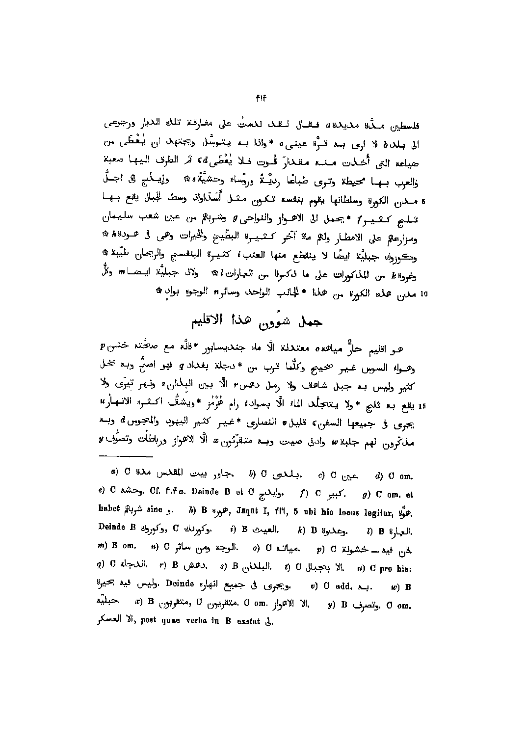 فلسطين مدّة مديدة [1] فقال لقد ندمت على مفارقة تلك الديار ورجوعي الى بلد [2] لا ارى به قرّة عيني [3] وإذا به يتوسّل ويجتهد ان يعطى من ضياعه التي أخذت منه مقدار قوت فلا يعطى [4] ، ثم الطرق اليها صعبة والعرب بها محيطة وترى طباعا رديّة ورؤساء وحشيّة [5] وإيذج هي اجلّ مدن الكورة وسلطانها يقوم بنفسه تكون مثل أسداواذ وسط الجبال يقع بها ثلج كثير [6] يحمل الى الأهواز والنواحي [7] وشربهم من عين شعب سليمان ومزارعهم على الامطار ولهم ماء آخر كثيرة البطّيخ والخيرات وهي في هودة [8] وكوزوك جبليّة أيضا لا ينقطع منها العنب [9] كثيرة البنفسج والريحان طيّبة وغروة [10] من المذكورات على ما ذكرنا من العمارات [11] ولاذ جبليّة أيضا [12] وكلّ مدن هذه الكورة من هذا الجانب الواحد وسائر [13] الوجوه بواد